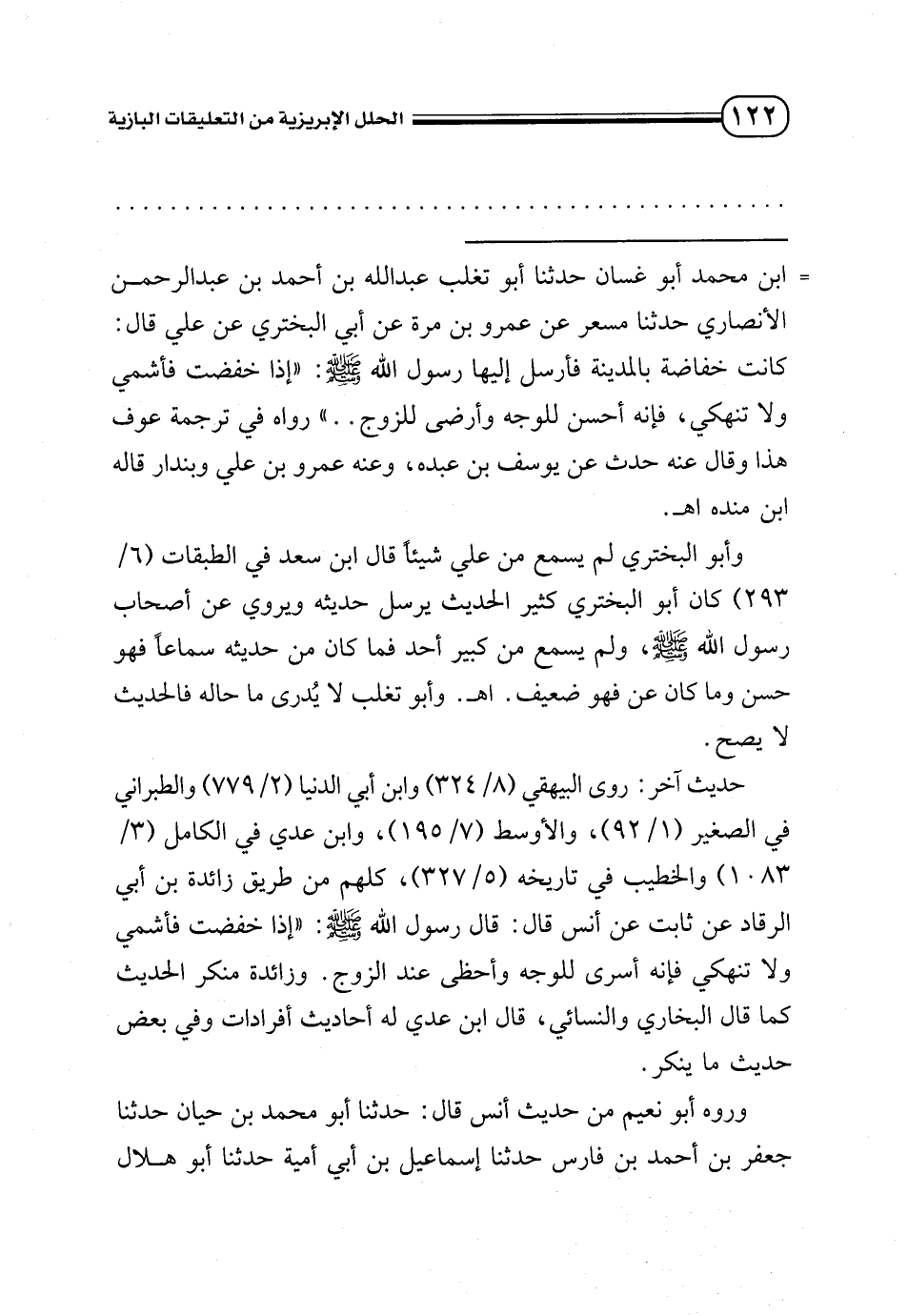 = بن محمد أبو غسان حدثنا أبو تغلب عبد الله بن أحمد بن عبد الرحمن الأنصاري حدثنا مسعر عن عمرو بن مرة عن أبي البختري عن علي قال: كانت خفاضة بالمدينة فأرسل إليها رسول الله - صلى الله عليه وسلم -: «إذا خفضت فأشمي ولا تنهكي، فإنه أحسن للوجه وأرضى للزوج .. » رواه في ترجمة عوف هذا وقال عنه حدث عن يوسف بن عبده، وعنه عمرو بن علي وبندار قاله ابن منده اهـ.
