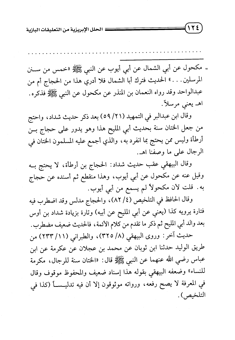 وقال ابن عبد البر في التمهيد (21/ 59) بعد ذكر حديث شداد، واحتج من جعل الختان سنة بحديث أبي المليح هذا وهو يدور على حجاج بن أرطأة وليس ممن يحتج بما انفرد به، والذي أجمع عليه المسلمون الختان في الرجال على ما وصفنا اهـ.