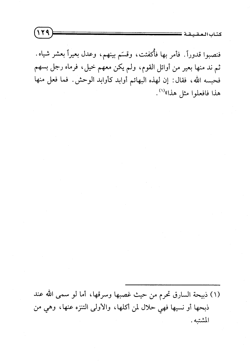 فنصبوا قدورًا. فأمر بها فأُكفئت، وقسَم بينهم، وعدل بعيرًا بعشر شياه. ثم ند بعير منها بعير من أوائل القوم، ولم يكن معهم خيل، فرماه رجل بسهم فحبسه الله، فقال: إن لهذه البهائم أوابد كأوابد الوحش. فما فعل منها هذا فافعلوا مثل هذا» (¬1).
