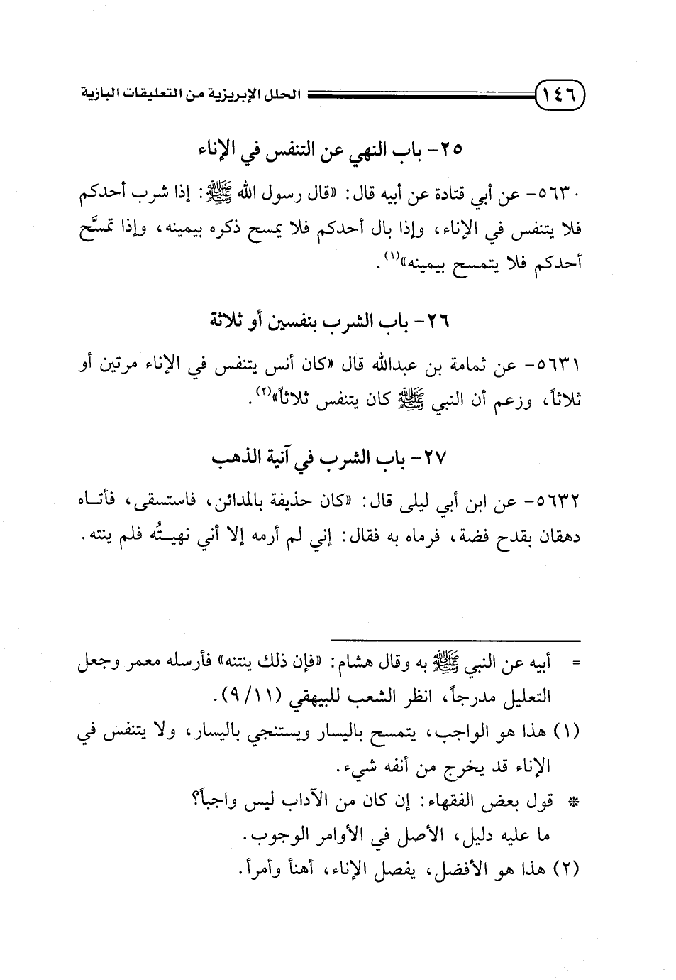 5631 - عن ثمامة بن عبد الله «قال كان أنس يتنفس في الإناء مرتين أو ثلاثًا، وزعم أن النبي - صلى الله عليه وسلم - كان يتنفس ثلاثًا» (¬2).