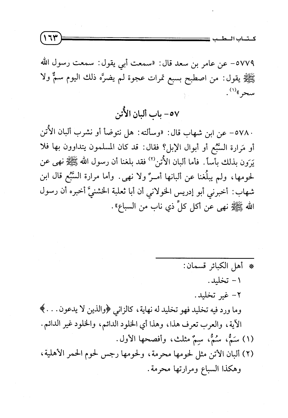 5780 - عن ابن شهاب قال: «وسألته: هل نتوضأ أو نشرب ألبان الأُتن أو مَرارة السَّبُع أو أبوال الإبل؟ فقال: قد كان المسلمون يتداوون بها فلا يَرَون بذلك بأسًا. فأما ألبان الأُتن (¬2) فقد بلغنا أن رسول الله - صلى الله عليه وسلم - نهى عن لحومها، ولم يبلُغنا عن ألبانها أمرٌ ولا نهي. وأما مرارة السَّبُع قال ابن شهاب: أخبرني أبو إدريس الخولاني أن أبا ثعلبة الخشنيَّ أخبره أن رسول الله - صلى الله عليه وسلم - نهى عن أكل كلِّ ذي ناب من السباع».
