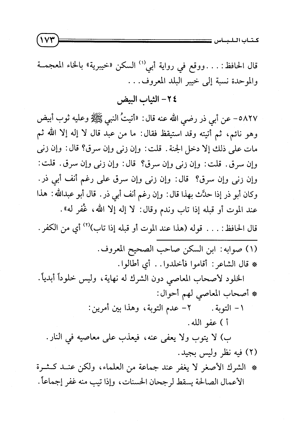 5827 - عن أبي ذر - رضي الله عنه - قال: «أتيت النبي - صلى الله عليه وسلم - وعليه ثوب أبيض وهو نائم، ثم أتيته وقد استيقظ فقال: ما من عبد قال لا إله إلا الله ثم مات على ذلك إلا دخل الجنة. قلت: وإن زنى وإن سرق؟ قال: وإن زنى وإن سرق. قلت: وإن زنى وإن سرق؟ قال: وإن زنى وإن سرق. قلت: وإن زنى وإن سرق؟ قال: وإن زنى وإن سرق على رغم أنف أبي ذر. وكان أبو ذر إذا حدَّث بهذا قال: وإن رغم أنف أبي ذر. قال أبو عبد الله: هذا عند الموت أو قبله إذا تاب وندم وقال: لا إله إلا الله، غُفر له».