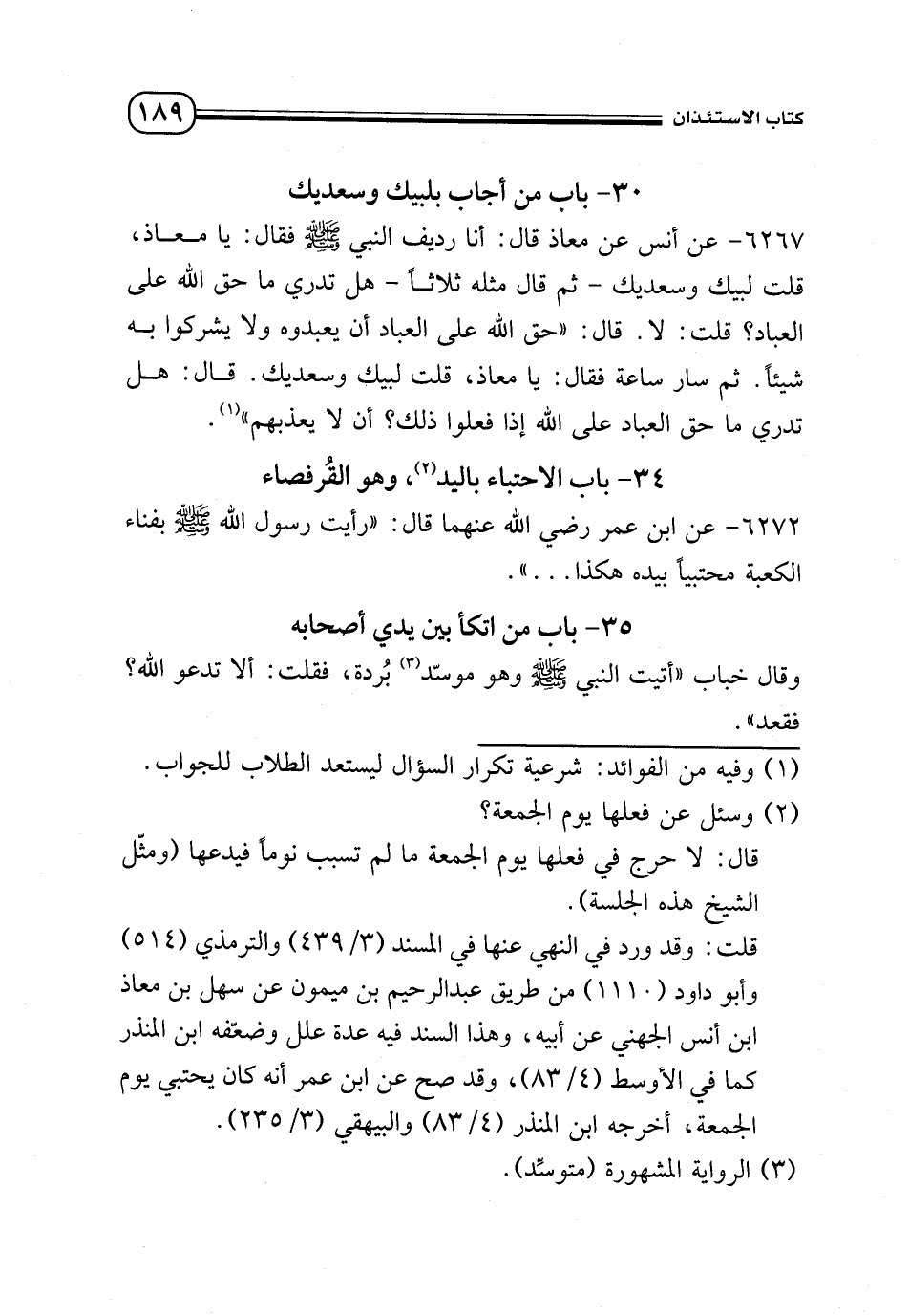 6272 - عن ابن عمر - رضي الله عنهما - قال: «رأيت رسول الله - صلى الله عليه وسلم - بفناء الكعبة محتبيًا بيده هكذا ... ».