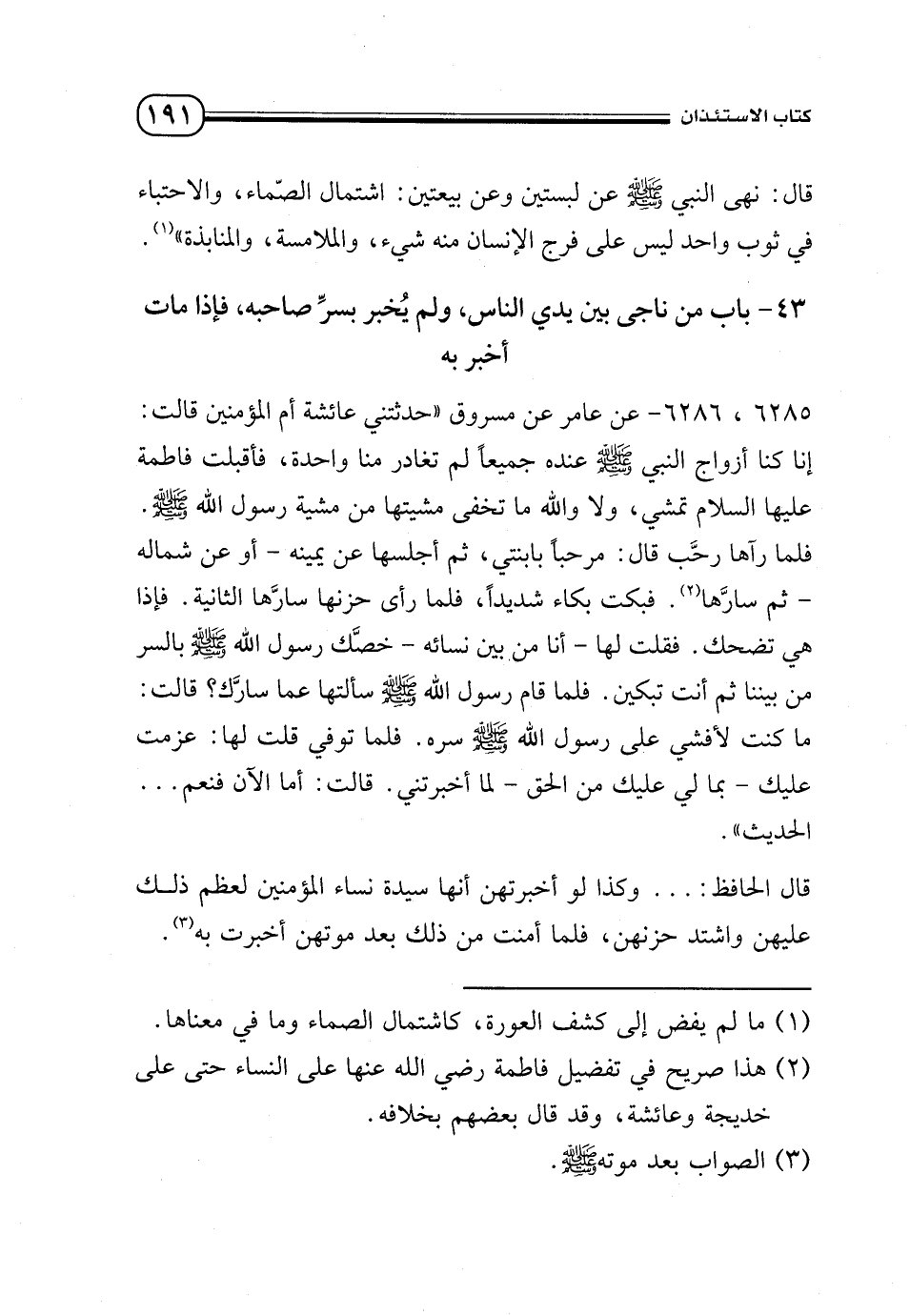 6285، 6286 - عن عامر عن مسروق «حدثتني عائشة أم المؤمنين قالت: إنا كنا أزواج النبي - صلى الله عليه وسلم - عنده جميعًا لم تغادر منا واحدة، فأقبلت فاطمة - عليها السلام - تمشي، لا والله ما تخفى مشيتها من مشية رسول الله - صلى الله عليه وسلم -. فلما رآها رحَّب قال: مرحبًا بابنتي، ثم أجلسها عن يمينه - أو عن شماله - ثم سارَّها (¬2). فبكت بكاء شديدًا، فلما رأى حزنها سارَّها الثانية. فإذا هي تضحك. فقلت لها - أنا من بين نسائه - خصَّك رسول الله - صلى الله عليه وسلم - بالسر من بيننا ثم أنت تبكين. فلما قام رسول الله - صلى الله عليه وسلم - سألتها عما سارَّك؟ قالت: ما كنت لأفشي على رسول الله - صلى الله عليه وسلم - سره. فلما توفي قلت لها: عزمت عليك - بما لي عليك من الحق - لما أخبرتني. قالت: أما الآن فنعم ... الحديث».