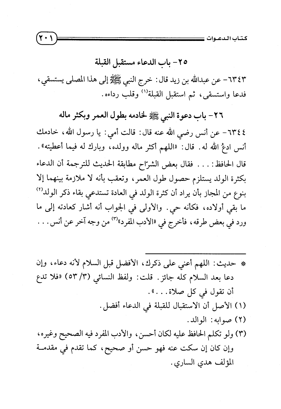 قال الحافظ: ... فقال بعض الشرّاح مطابقة الحديث للترجمة أن الدعاء بكثرة الولد يستلزم حصول طول العمر، وتعقب بأنه لا ملازمة بينهما إلا بنوع من المجاز بأن يراد أن كثرة الولد في العادة تستدعي بقاء ذكر الولد (¬2) ما بقي أولاده، فكأنه حي. والأولى في الجواب أنه أشار كعادته إلى ما ورد في بعض طرقه، فأخرج في «الأدب المفرد» (¬3) من وجه آخر عن أنس ...