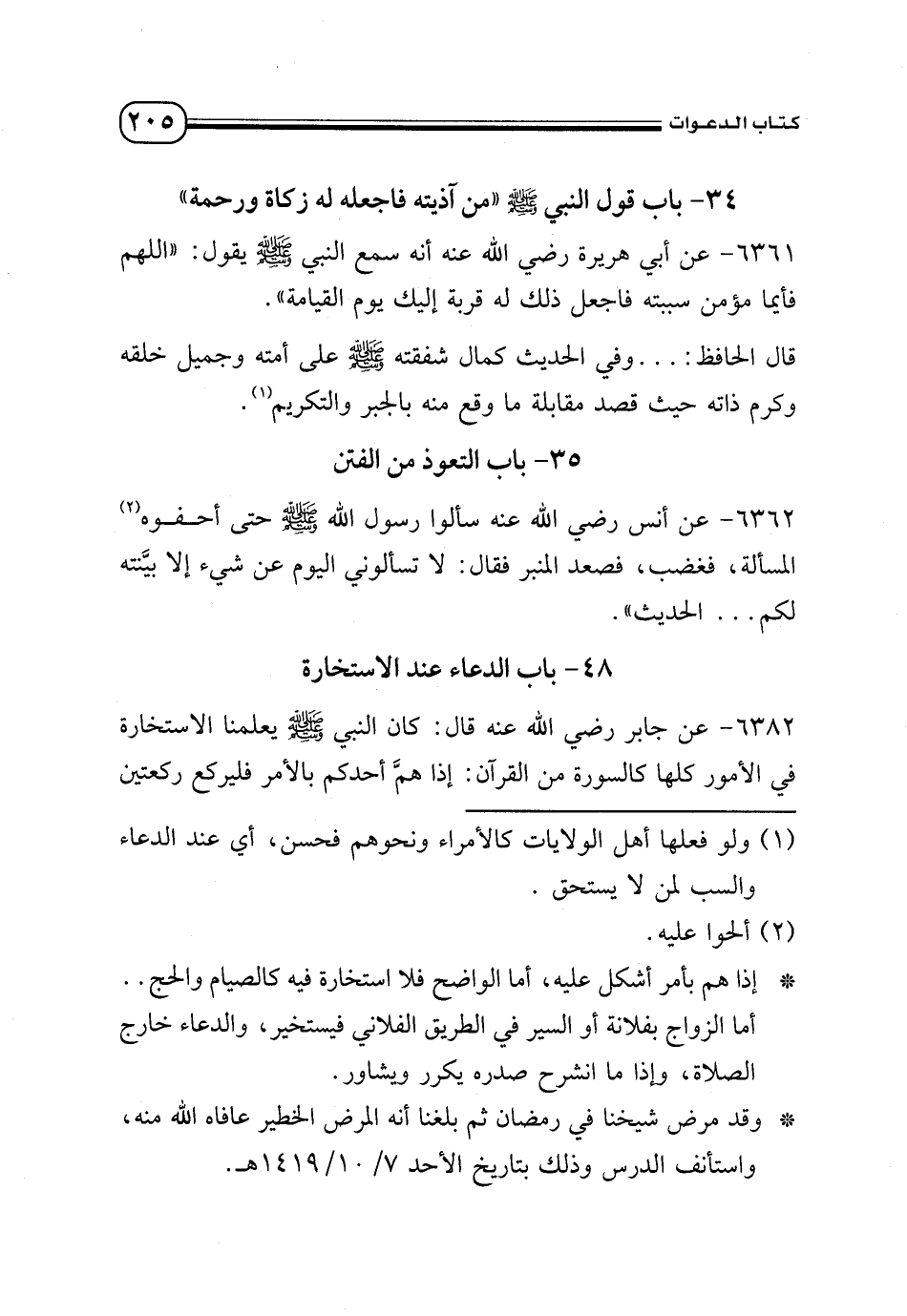 * وقد مرض شيخنا في رمضان ثم بلغنا أنه المرض الخطير عافاه الله منه، واستأنف الدرس وذلك بتاريخ الأحد 7/ 10/1419 هـ.