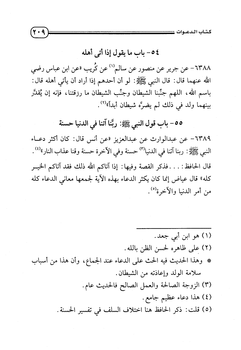 6388 - عن جرير عن منصور عن سالم (¬1) عن كُريب «عن ابن عباس رضى الله عنهما قال: النبي - صلى الله عليه وسلم -: لو أن أحدهم إذا أراد أن يأتي أهله قال: باسم الله، اللهم جنَّبنا الشيطان وجنَّب الشيطان وجنَّب الشيطان ما رزقتنا، فإنه إن يُقدَّر بينهما ولد في ذلك لم يضرَّه شيطان أبدًا» (¬2).