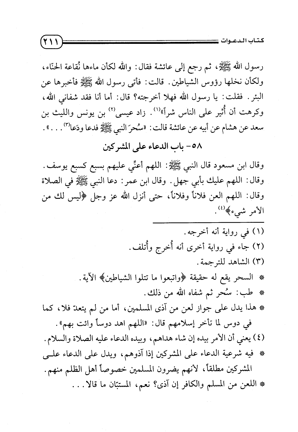 رسول الله - صلى الله عليه وسلم -، إلى عائشة فقال: والله لكأن ماءها نُقاعة الحنّاء، ولكأن نخلها رؤوس الشياطين. قالت: فأتى رسول الله - صلى الله عليه وسلم - فأخبرها عن البئر. فقلت: يا رسول الله فهلا أخرجته؟ قال: أما أنا فقد شفاني الله، وكرهت أن أثير على الناس شرًا» (¬1). زاد عيسى (¬2) بن يونس والليث بن سعد عن هشام عن أبيه عن عائشة قالت: «سحر النبي - صلى الله عليه وسلم - فدها ودعا (¬3) ... ».