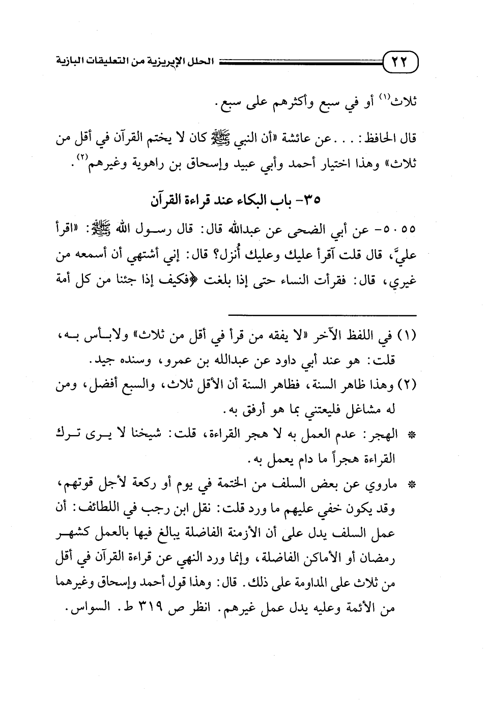 قال الحافظ: ... عن عائشة «أن النبي - صلى الله عليه وسلم - كان لا يختم القرآن في أقل من ثلاث» وهذا اختيار أحمد وأبي عبيد وإسحاق بن راهوية وغيرهم (¬2).