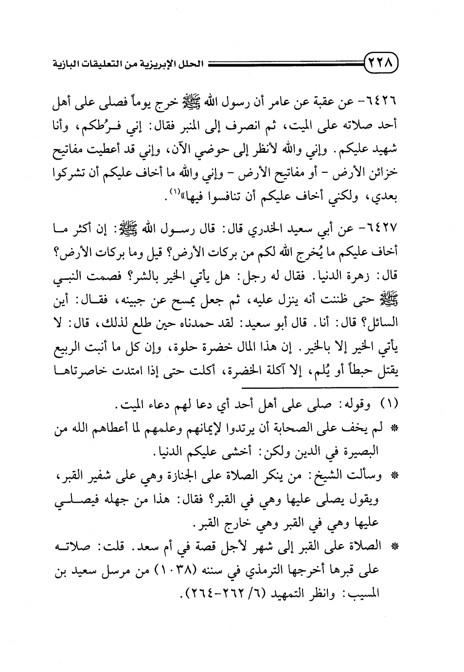 6426 - عن عقبة عن عامر أن رسول الله - صلى الله عليه وسلم - خرج يومًا فصلى على أهل أحد صلاته على الميت، ثم انصرف إلى المنبر فقال: إني فرطكم، وأنا شهيد عليكم. وإني والله لأنظر إلى حوضي الآن، وإني قد أعطيت مفاتيح خزائن الأرض- أو مفاتيح الأرض- وإني والله ما أخاف عليكم أن تشركوا بعدي، ولكني أخاف عليكم أن تنافسوا فيها» (¬1).