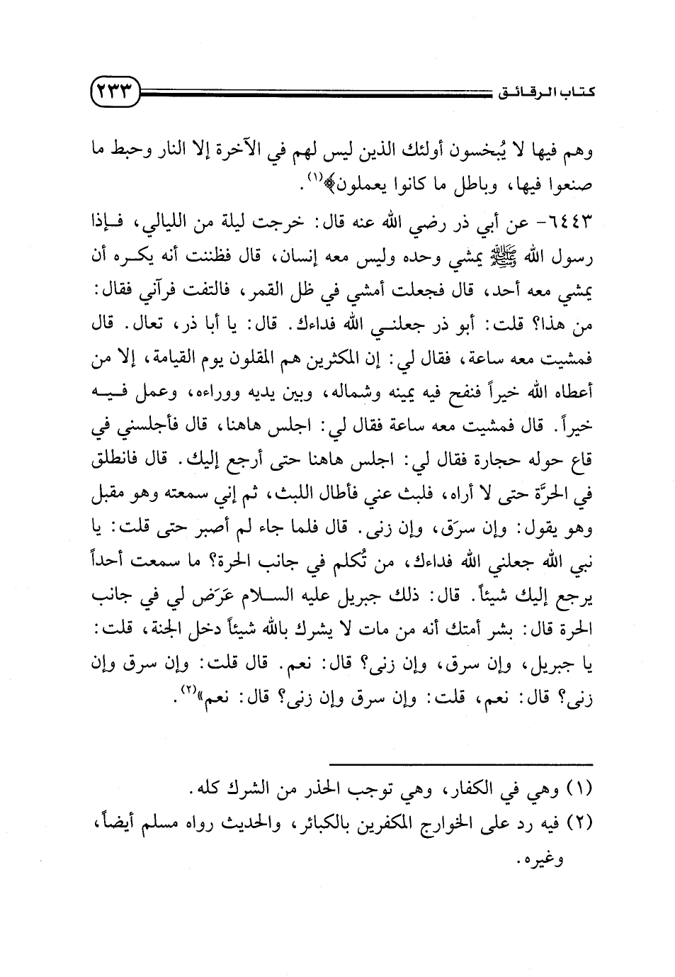 6443 - عن أبي ذر - رضي الله عنه - قال: خرجت ليلة من الليالي، فإذا رسول الله - صلى الله عليه وسلم - يمشي وحده وليس معه إنسان، قال فظننت انه يكسره أن يمشي معه احد، قال فجعلت أمشي في ظل القمر، فالتفت فرآني فقال: من هذا؟ قلت: أبو ذر جعلني الله فداءك. قال: يا أبا ذر، تعال. قال فمشيت معه ساعة، فقال لي: إن المكثرين هم المقلون يوم القيامة، إلا من اعطاه الله خيرًا فنفخ فيه يمينه وشماله، وبين يديه ووراءه، وعمل فيه خيرًا. قال فمشيت معه ساعة فقال لي: اجلس هاهنا، قال فأجلسني في قاع حوله حجارة فقال ليك اجلس هاهنا حتى أرجع إليك. قال فانطلق في الحرة حتى لا أراه، فلبث عني فأطال اللبث، ثم إني سمعته وهو مقبل وهو يقول: وإن سرق، وإن زنى. قال فلما جاء لم أصبر حتى قلت: يا نبي الله جعلني الله فداءك، من تكلم في جانب الحرة؟ ما سمعت أحدًا يرجع إليك شيئًا. قال ذلك جبريل - عليها السلام - عرض لي في جانب الحرة قال: بشر أمتك أنه من مات لا يشرك بالله شيئًا دخل الجنة، قلت: يا جبريل: وإن سرق، وإن زنى؟ قال: نعم. قال قلت: وإن سرق وإن زنى؟ قال: نعم، قلت: وإن سرق وإن زنى؟ قال: نعم» (¬2).