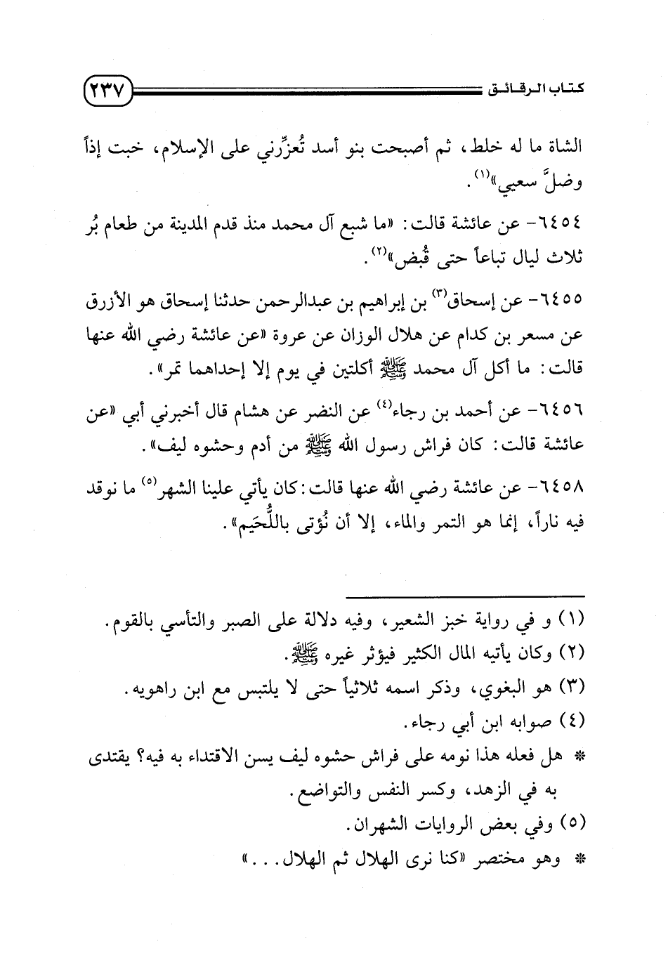 6456 - عن أحمد بن رجاء (¬4) عن النضر عن هشام قال أخبرني أبي «عن عائشة قالت: كان فراش رسول الله - صلى الله عليه وسلم - من أدم وحشوه ليف».