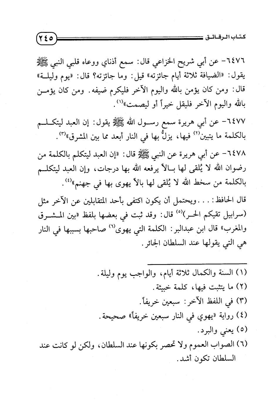6477 - عن أبى هريرة سمع رسول الله - صلى الله عليه وسلم - يقول: «إن العبد ليتكلم بالكلمة ما يتبين (¬2) فيها يزل بها في النار أبعد مما بين المشرق» (¬3).