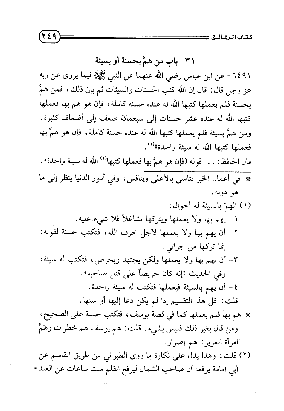 (¬2) قلت: وهذا يدل على نكارة ما روى الطبراني من طريق القاسم عن أبي أمامة يرفعه أن صاحب الشمال ليرفع القلم ست ساعات عن العبد المسلم فإن ندم واستغفر الله منها ألقاها وإلا كتب واحدة، فبمجرد الفعل تكتب السيئة، والقاسم بن عبد الرحمن له مناكير.