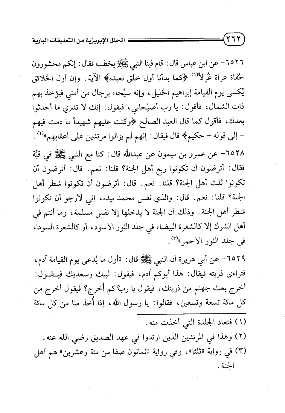 6526 - عن ابن عباس قال: فينا النبي - صلى الله عليه وسلم - يخطب فقال: «إنكم محشورون حفاة عراة غرلا (¬1) {كَمَا بَدَأْنَا أَوَّلَ خَلْقٍ نُعِيدُهُ} [الأنبياء: 104] الآية. وإن أول الخلائق يكسى يوم القيامة إبراهيم الخليل، وإنه سيجاء برجال من أمتي فيؤخذ بهم ذات الشمال، فأقول: يارب أصيحابي، فيقول: إنك لا تدري ما أحدثوا بعدك، فأقول كما قال العبد الصالح {وَكُنْتُ عَلَيْهِمْ شَهِيدًا مَا دُمْتُ فِيهِمْ - إلى قوله - الْحَكِيمُ} قال فيقال: إنهم لم يزالوا مرتدين على أعقابهم» (¬2).