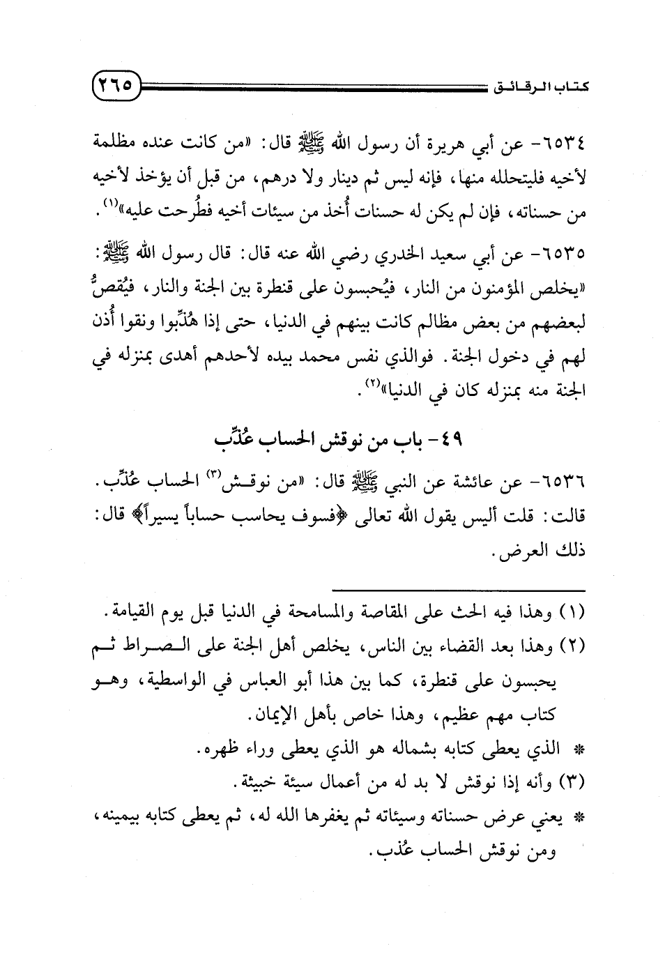 6536 - عن عائشة عن النبي - صلى الله عليه وسلم - قال: «من نوقش (¬3) الحساب عُذب. قالت: قلت أليس يقول الله تعالى {فَسَوْفَ يُحَاسَبُ حِسَابًا يَسِيرًا} قال: ذلك العرض».
