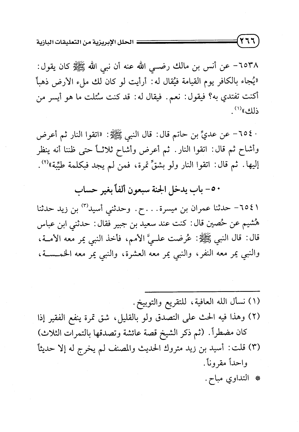 654 - عن عدي بن حاتم قال: قال النبي - صلى الله عليه وسلم -: «اتقوا النار ثم أعرض وأشاح ثم قال: أتقوا النار. ثم أعرض وأشاح ثلاثًا حتى ظننا أنه ينظر إليها. ثم قال: اتقوا النار ولو بشق تمرة، فمن لم يجد فبكلمة طيبة» (¬2).