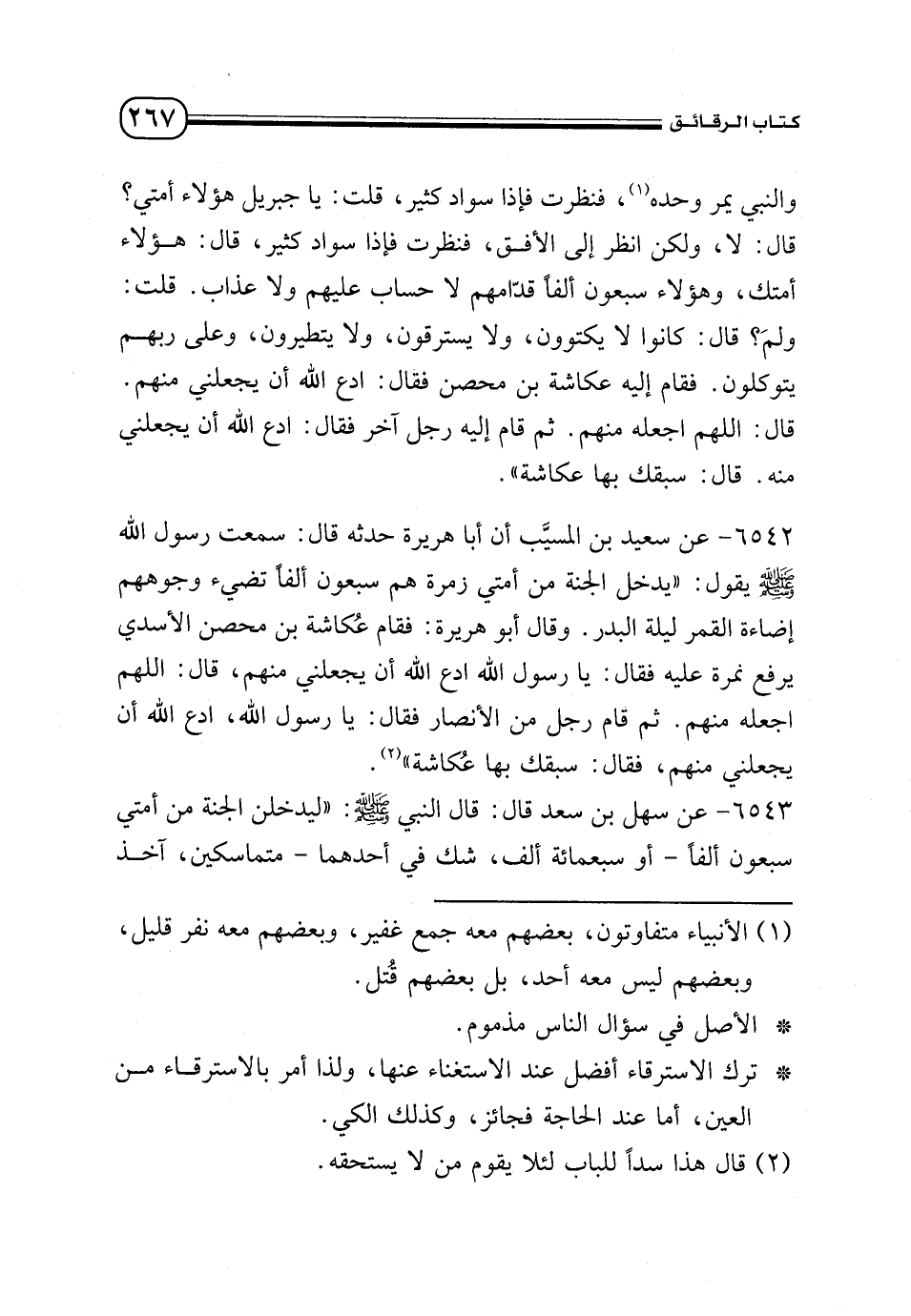 6542 - عن سعيد بن المسيب أن أبا هريرة حدثه قال: سمعت رسول الله - صلى الله عليه وسلم - يقول: «يدخل الجنة من أمتي زمرة هم سبعون ألفاَ تضئ وجوههم إضاءة القمر ليلة البدر. وقال أبو هريرة فقام عكُاشة بن المحصن الأسدي يرفع نمرة عليه فقال: يا رسول الله ادعي الله أن يجعلني منهم، قال: اللهم اجعله منهم. ثم قام رجل من الأنصار فقال: يا رسول الله، ادع الله أن يجعلني منهم، فقال: سبقك بها عكُاشة» (¬2).