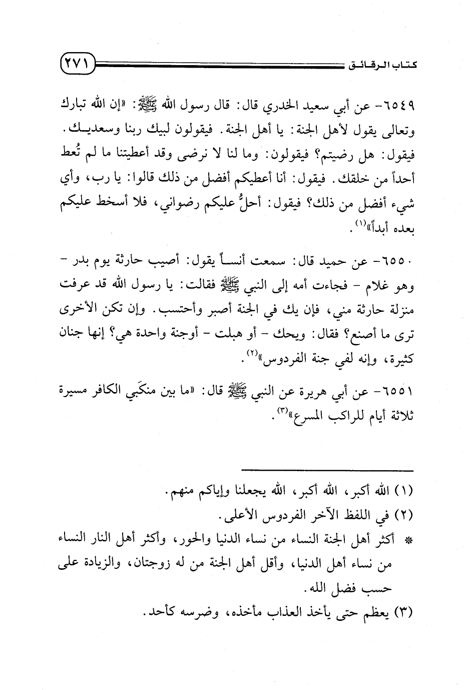 6550 - عن حميد قال: سمعت أنساُ يقول: أصيب حارثة يوم بدر - وهو غلام- فجاءت أمه إلي النبي - صلى الله عليه وسلم - فقالت يا رسول الله قد عرفت منزلة حارثة مني، فإن يك في الجنة أصبر وأحتسب. وإن تك الأخري تري ما أصنع؟ فقال: ويحك - أو هبلت - أو جنة واحدة هي؟ إنها جنان كثيرة، وإنه لفي جنة الفردوس» (¬2).