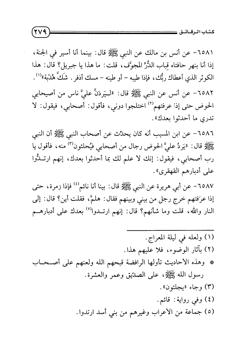 6587 - عن أبي هريرة عن النبي - صلى الله عليه وسلم - قال: بينا أنا نائم (¬4) فإذا زمرة، حتي إذا عرفتهم خرج رجل من بيني وبينهم فقال: هلم، فقلت أين؟ قال: إلي النار والله، قلت وما شأنهم؟ قال: إنهم ارتدوا (¬5) بعدك علي أدبارهم