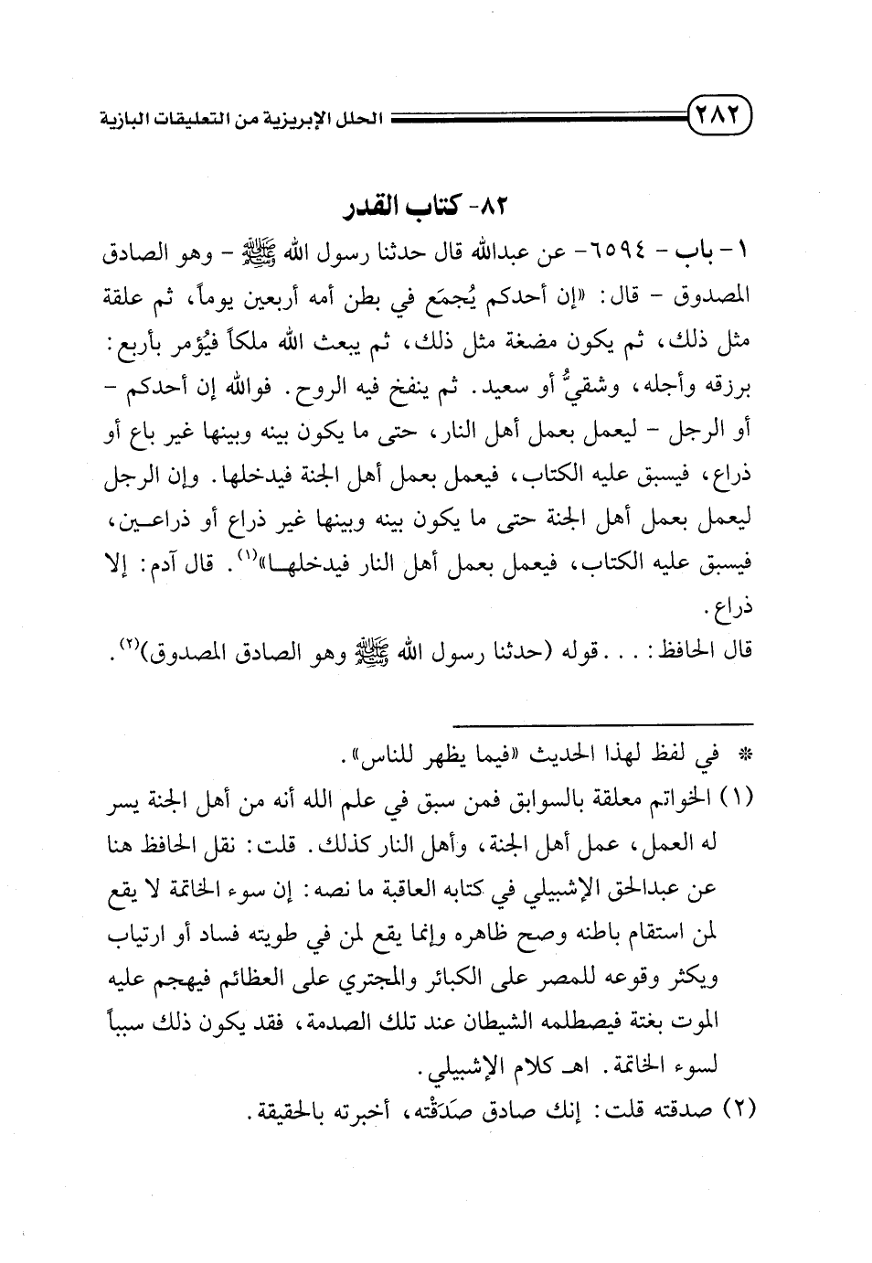 6594 - عن عبد الله قال حدثنا رسول الله - صلى الله عليه وسلم - - وهو الصادق المصدوق - قال: «إن أحدكم يُجمع في بطن أمه أربعين يومًا، ثم علقة مثل ذلك، ثم يكون مضغة مثل ذلك، ثم يبعث الله ملكًا فيؤمر بأربع برزقه وأجله، وشقي أو عيد. م ينفخ فيه الروح. فوالله إن أحدكم - أوالرجل -ليعمل بعمل أهل النار، حتي ما يكون بينه وبينها غير باع أو ذراع، فيسبق عليه الكتاب، فيعمل بعمل أهل الجنة فيدخلها (¬1).