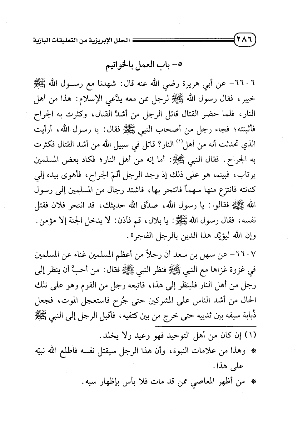 6607 - عن سهل بن سعد أن رجلًا من أعظم المسلمين غناء عن المسلمين في غزوة غزاها مع النبي - صلى الله عليه وسلم - فنظر النبي - صلى الله عليه وسلم - فقال: من أحب أن ينظر إلي رجل من أهل النار فلينظر إلي هذا، فاتبعه رجل من القوم وهو على تلك الحال من أشد الناس على المشركين حتى جُرح فاستعجل الموت، فجعل ذُبابة سيفه بين ثدييه حتى خرج من بين كتفيه، فأقبل الرجل إلي النبي - صلى الله عليه وسلم -.