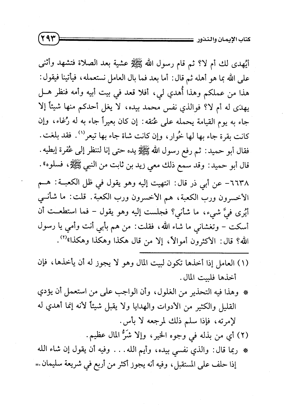 6638 - عن أبي ذر قال: انتهيت إليه وهو يقول في ظل الكعبة: هم الأخسرون ورب الكعبة، هم الأخسرون ورب الكعبة. قلت: ما شأني أيُرى فيَّ شيء، ما شأني؟ فجلست إليه وهو يقول -فما استطعت أن أسكت- وتغشاني ما شاء الله، فقلت: من هم بأبي أنت وأمي يا رسول الله؟ قال: الأكثرون أموالًا، إلا من قال هكذا وهكذا وهكذا» (¬2).