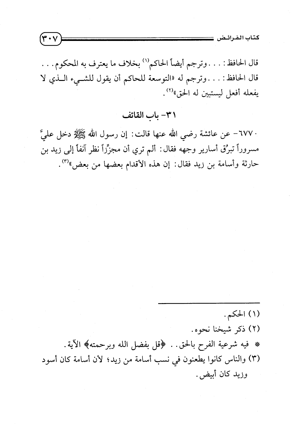 6770 - عن عائشة - رضي الله عنها - قالت: إن رسول الله - صلى الله عليه وسلم - دخل عليَّ مسرورًا تبرُق أسارير وجهه فقال: ألم تري أ، مجزِّزًا نظر آنفًا إلى زيد بن حارثة وأسامة بن زيد فقال: إن هذه الأقدام بعضها من بعض» (¬3).