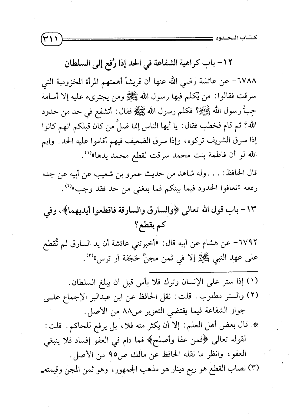 (¬3) نصاب القطع هو ربع دينار هو مذهب الجمهور، وهو ثمن المجن وقيمته ثلاثة دراهم وكان الدينار على عهد المصطفى قيمته 12 درهمًا ربعها ثلاثة دراهم .. ربع دينار = سبع جنيه.
