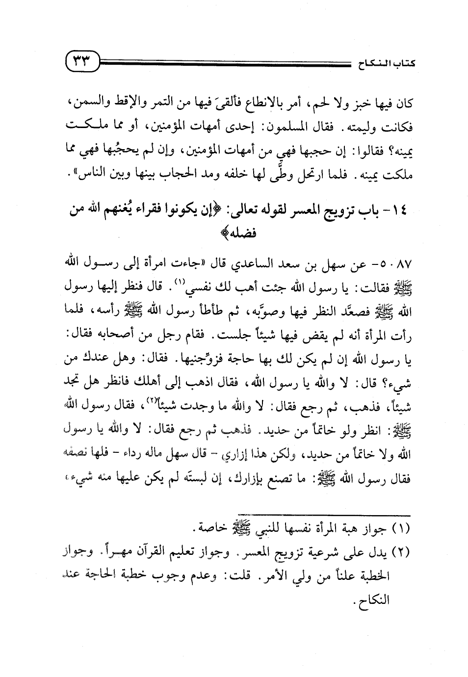 5087 - عن سهل بن سعد الساعدي، قال: «جاءت امرأة إلى رسول الله - صلى الله عليه وسلم -، فقالت: يا رسول الله، جئت أهب لك نفسي (¬1). قال: فنظر إليها رسول الله - صلى الله عليه وسلم - فصعَّد النظر فيها وصوَّبه، ثم طأطأ رسول الله - صلى الله عليه وسلم - رأسه، فلما رأت المرأة أنه لم يقض فيها شيئًا جلست. فقام رجل من أصحابه، فقال: يا رسول الله، إن لم يكن لك بها حاجة فزوِّجنيها. فقال: وهل عندك من شيء؟ قال: لا والله يا رسول الله، فقال: اذهب إلى أهلك فانظر هل تجد شيئًا، فذهب، ثم رجع، فقال: لا والله ما وجدت شيئًا (¬2)، فقال رسول الله - صلى الله عليه وسلم -: انظر ولو خاتمًا من حديد، فذهب ثم رجع، فقال: لا والله يا رسول الله ولا خاتمًا من حديد، ولكن هذا إزاري - قال سهل: ما له رداء - فلها نصفه، فقال رسول الله - صلى الله عليه وسلم -: ما تصنع بإزارك إن لبستَه لم يكن عليها منه شيء،