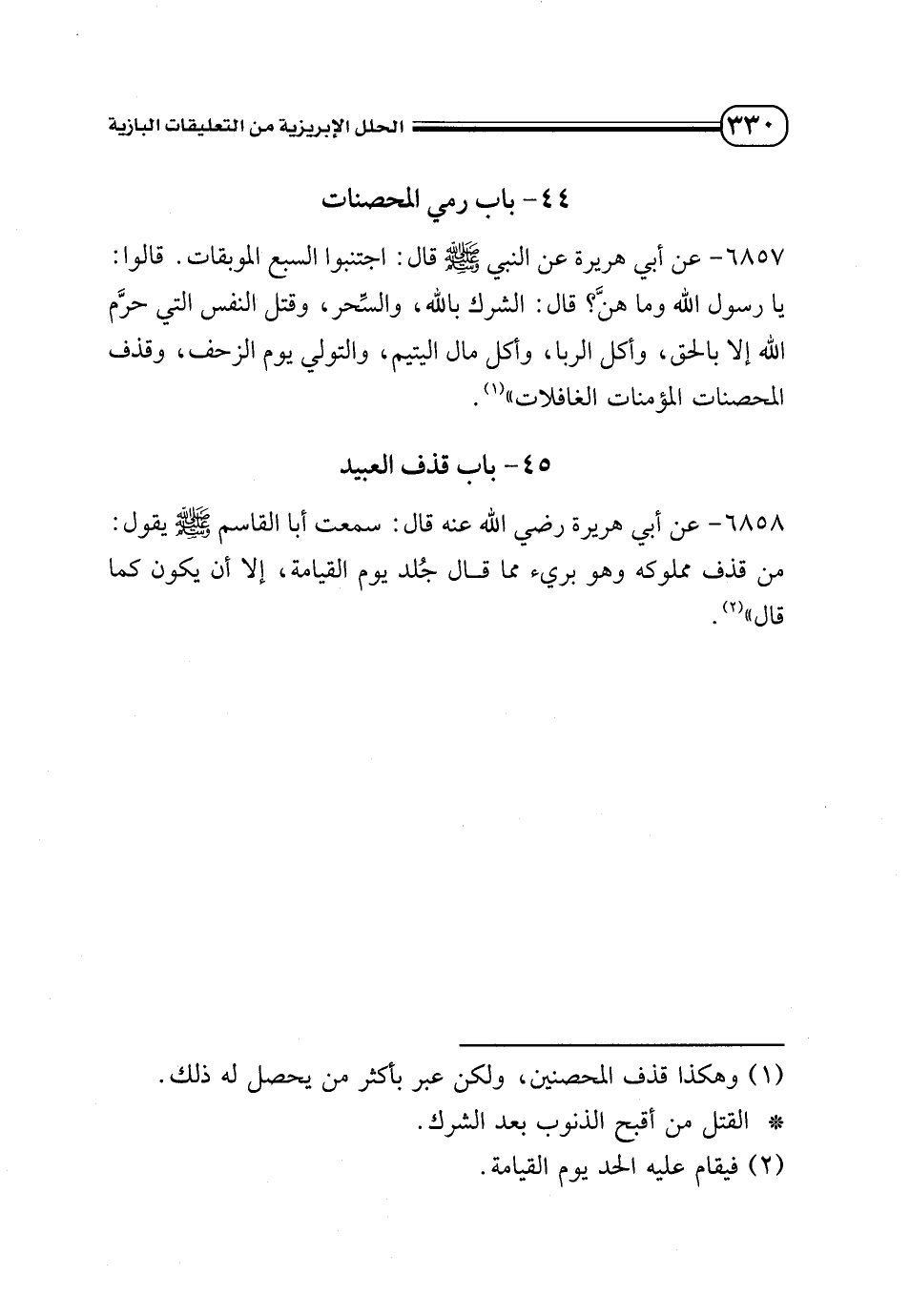 6857 - عن أبي هريرة عن النبي - صلى الله عليه وسلم - قال: «اجتنبوا السبع الموبقات. قالوا: يا رسول الله وما هنَّ؟ قال: الشرك بالله، والسِّحر، وقتل النفس التي حرَّم الله إلا بالحق، وأكل الربا، وأكل مال اليتيم، والتولي يوم الزحف، وقذف المحصنات المؤمنات الغافلات» (¬1).