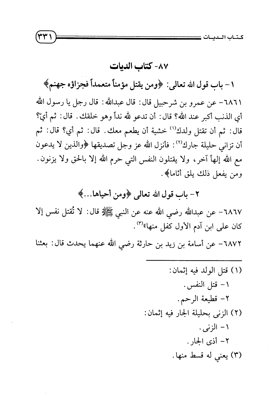 1 - باب قول الله تعالى: {وَمَنْ يَقْتُلْ مُؤْمِنًا مُتَعَمِّدًا فَجَزَاؤُهُ جَهَنَّمُ خَالِدًا فِيهَا وَغَضِبَ اللَّهُ عَلَيْهِ وَلَعَنَهُ وَأَعَدَّ لَهُ عَذَابًا عَظِيمًا} [النساء: 93]