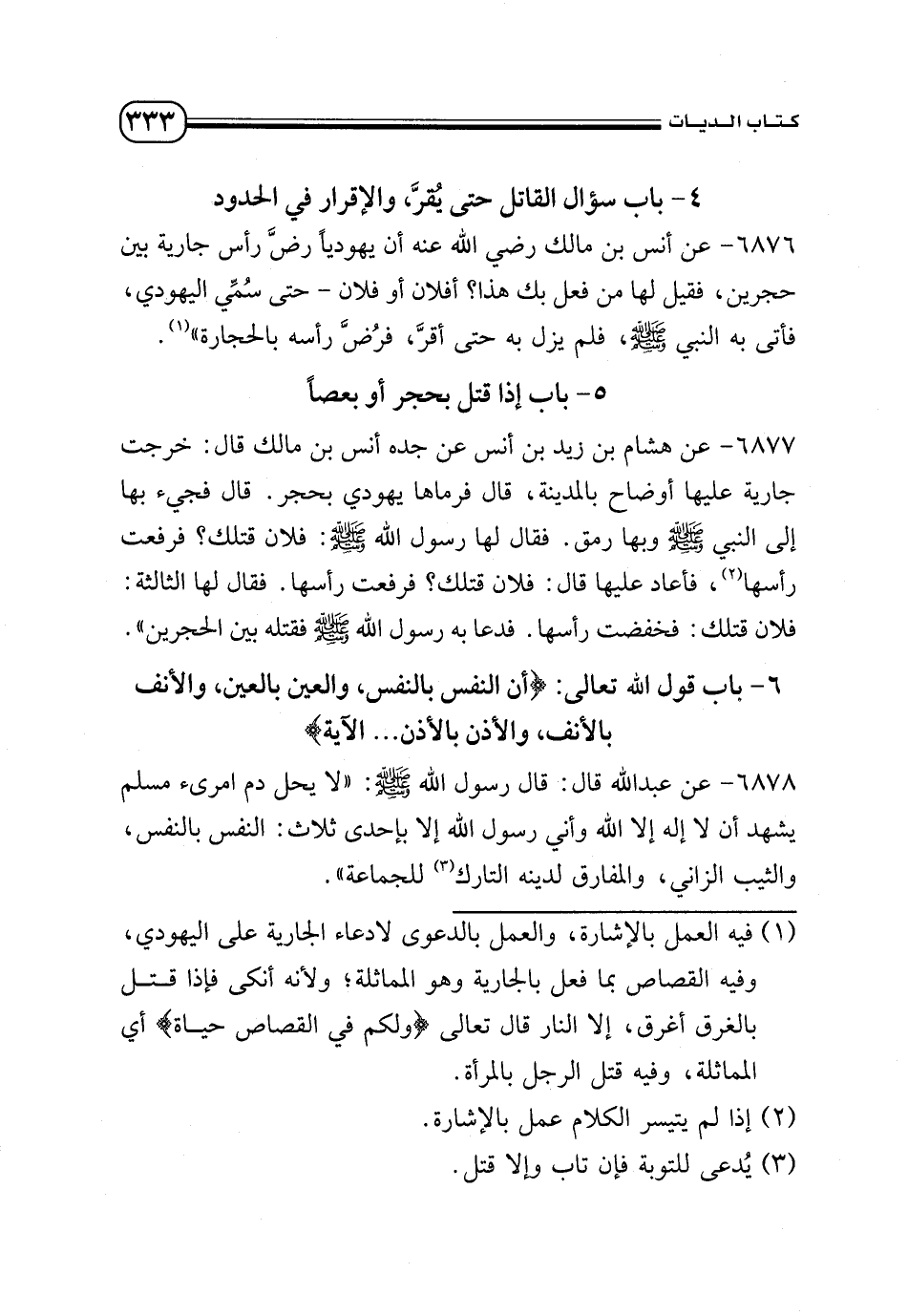 6876 - عن أنس بن مالك - رضي الله عنه - أن يهوديًا رضَّ رأس جارية بين حجرين، فقيل لها من فعل بك هذا؟ أفلان أو فلان -حتى سُمِّي اليهودي، فأتى به النبي - صلى الله عليه وسلم -، فلم يزل به حتى أقرَّ، فرُضَّ رأسه بالحجارة» (¬1).