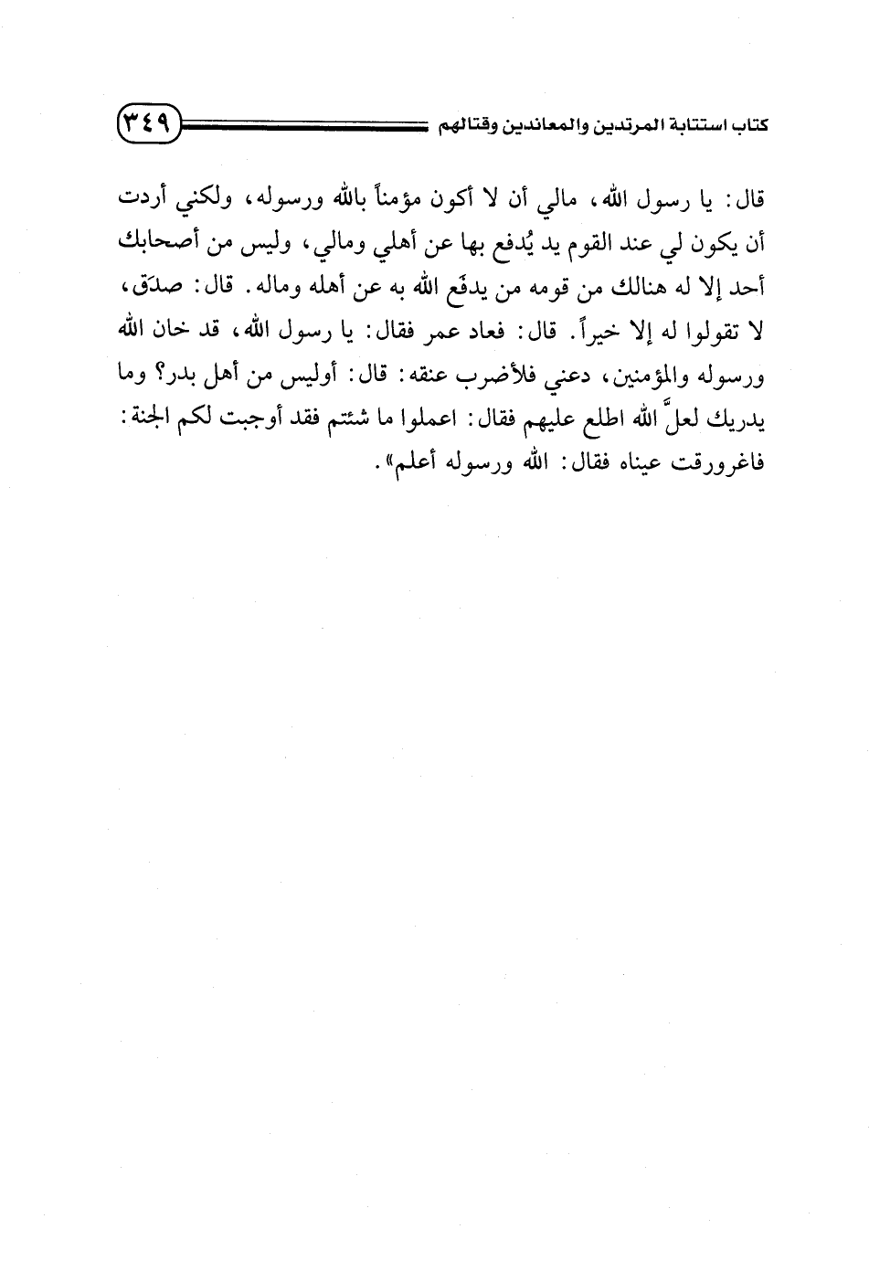 قال: يا رسول الله، مالي أن لا أكون مؤمنًا بالله ورسوله، ولكني أردت أن يكون لي عند القوم يد يُدفع بها عن أهلي ومالي، وليس من أصحابك أحد إلا له هنالك من قومه من يدفَع الله به عن أهله وماله. قال: صدَق، لا تقولوا له إلا خيرًا. قال: فعاد عمر فقال: يا رسول الله، قد خان الله ورسوله والمؤمنين، دعني فلأضرب عنقه: قال: أوليس من أهل بدر؟ وما يدريك لعلَّ الله اطلع عليهم فقال: اعملوا ما شئتم فقد أوجبت لكم الجنة: فاغرورقت عيناه فقال: الله ورسوله أعلم».