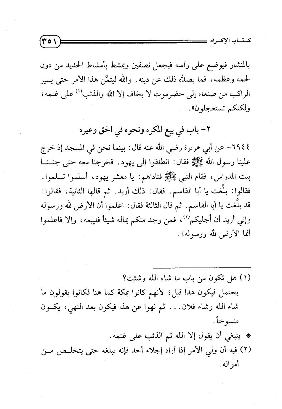 6944 - عن أبي هريرة - رضي الله عنه - قال: بينما نحن في المسجد إذ خرج علينا رسول الله - صلى الله عليه وسلم - فقال: «انطلقوا إلى يهود». فخرجنا معه حتى جئنا ببيت، المدارس، فقام النبي - صلى الله عليه وسلم - فناداهم: «يا معشر يهود، أسلموا تسلموا». فقالوا: بلّغت يا أبا القاسم. فقال: «ذلك أريد». ثم قالها الثانية، فقالوا: قد بلّغت يا أبا القاسم. ثم قال الثالثة فقال: «اعلموا أن الأرض لله ورسوله وأني أريد أن أُجليكم (¬2)، فمن وجد منكم بماله شيئًا فليبعه، وإلا فاعلموا أنما الأرض لله ورسوله».