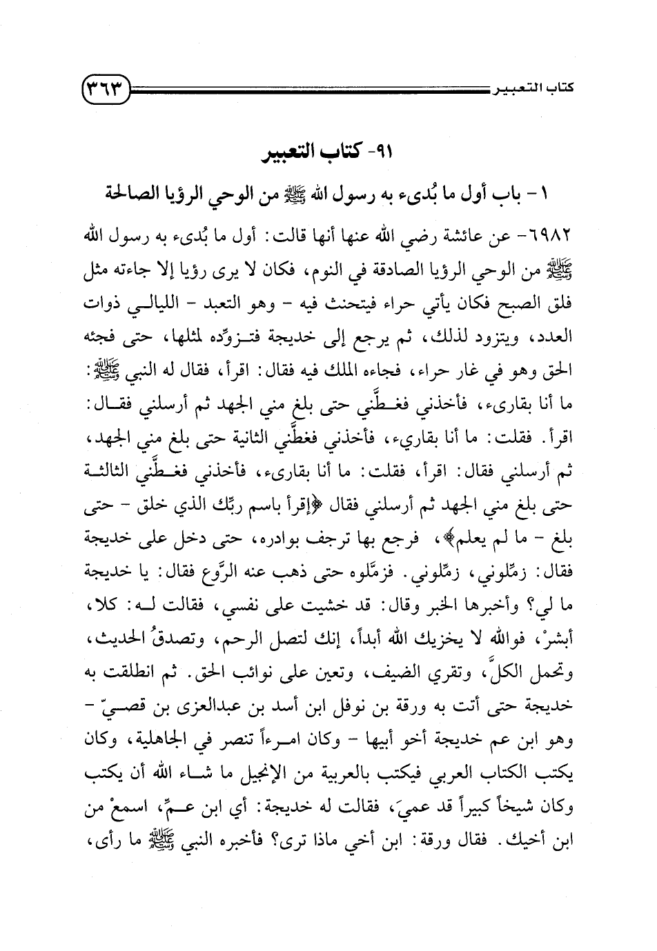 6982 - عن عائشة - رضي الله عنها - أنها قالت: أول ما بُدئ به رسول الله - صلى الله عليه وسلم - من الوحي الرؤيا الصادقة في النوم, فكان لا يري رؤيا إلا جاءته مثل فلق الصبح فكان يأتي حراء فيتحنث فيه - وهو التعبد - الليالي ذوات العدد, ويتزود لذلك, ثم يرجع إلي خديجة فتزوِّده لمثلها, حتي فجئه الحق وهو في غار حراء, فجاءه الملك فيه فقال: اقرأ, فقال له النبي - صلى الله عليه وسلم -: ما أنا بقارئ, فأخذني فغطَّني حتي بلغ مني الجهد ثم أرسلني فقال: اقرأ. فقلت: ما أنا بقارئ, فأخذني فغطَّني الثانية حتي بلغ مني الجهد, ثم أرسلني فقال: اقرأ, فقلت: ما أنا بقارئ, فأخذني فغطَّني الثالثة حتي بلغ مني الجهد ثم أرسلني فقال {اقْرَأْ بِاسْمِ رَبِّكَ الَّذِي خَلَقَ - حتي بلغ - مَا لَمْ يَعْلَمْ} , فرجع بها ترجف بوادره, حتي دخل علي خديجة فقال: زمِّلوني, زمِّلوني. فزمِّلوه حتي ذهب عنه الروَّع فقال: ياخديجة مالي؟ وأخبرها الخبر وقال: قد خشيت علي نفسي, فقالت له: كلا, أبشرْ, فو الله لا يخزيك الله أبدًا, إنك لتصل الرحم, وتصدقُ الحديث, وتحمل الكل, وتقري الضيف, وتعين علي نوائب الحق. ثم انطلقت به خديجة حتي أتت به ورقة بن نوفل ابن أسد بن عبد العزي بن قصيّ - وهو ابن عم خديجة أخو أبيها- وكان امرءًا تنصر في الجاهلية, وكان يكتب الكتاب العربي فيكتب بالعربية من الإنجيل ماشاء الله أن يكتب وكان شيخًا كبيرًا قد عميَ, فقالت له خديجة: أي ابن عمِّ, اسمعْ من ابن أخيك. فقال ورقة: ابن أخي ماذا تري؟ فأخبره النبي - صلى الله عليه وسلم - ما رأي,