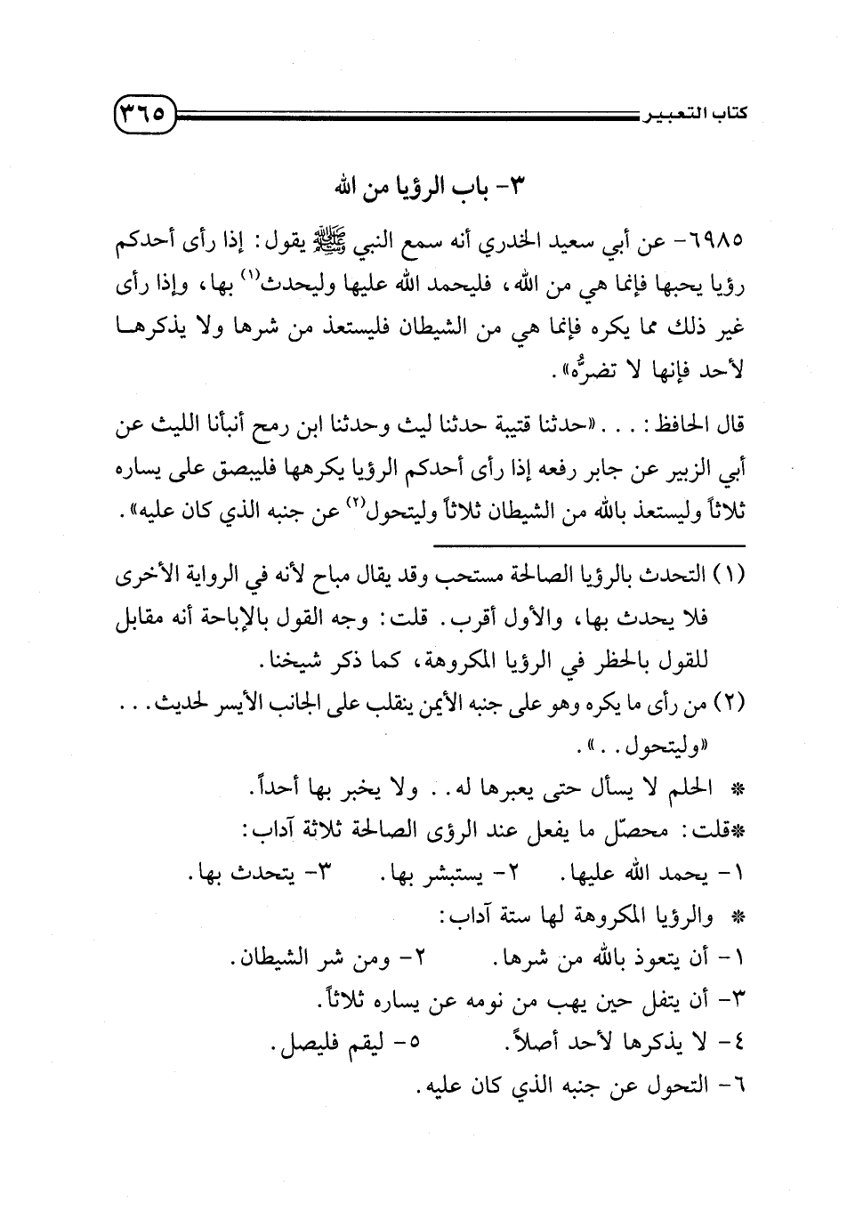 (¬1) التحدث بالرؤيا الصالحة مستحب وقد يقال مباح لأنه في الرواية الأخري فلا يحدث بها, والأول أقرب. قلت: وجه القول بالإباحة أنه مقابل للقول بالحظر في الرؤيا المكروهة, كما ذكر شيخنا.