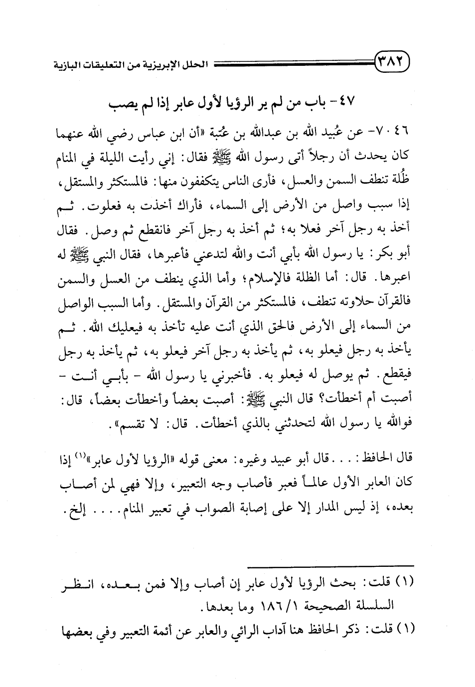 (¬1) قلت: بحث الرؤيا لأول عابر إن أصاب وإلا فمن بعده , انظر السلسلة الصحيحة 1/ 168 وما بعدها.