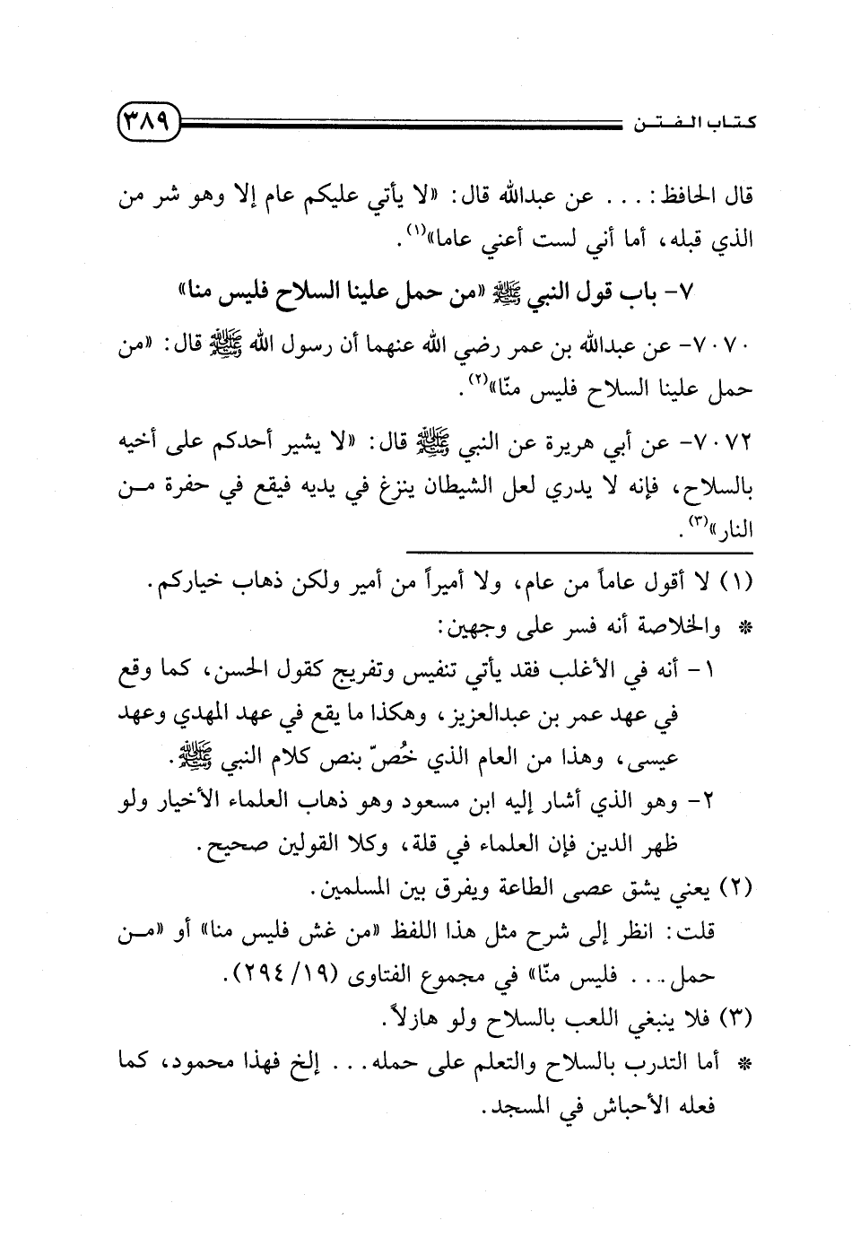 قلت: انظر إلى شرح مثل هذا اللفظ «من غش فليس منا» أو «من حمل ... فليس منا» في مجموع الفتاوى (19/ 294).