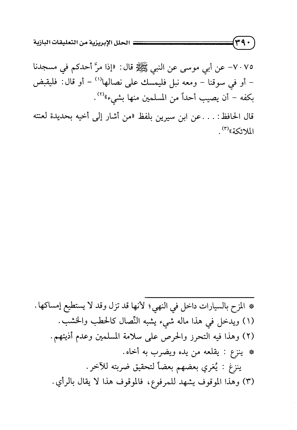7075 - عن أبي موسى عن النبي - صلى الله عليه وسلم - قال: «إذا مرَّ أحدكم في مسجدنا - أو في سوقنا - ومعه نبل فليمسك على نصالها (¬1) - أو قال: فليقبض بكفه - أن يصيب أحدًا من المسلمين منها بشيء» (¬2).