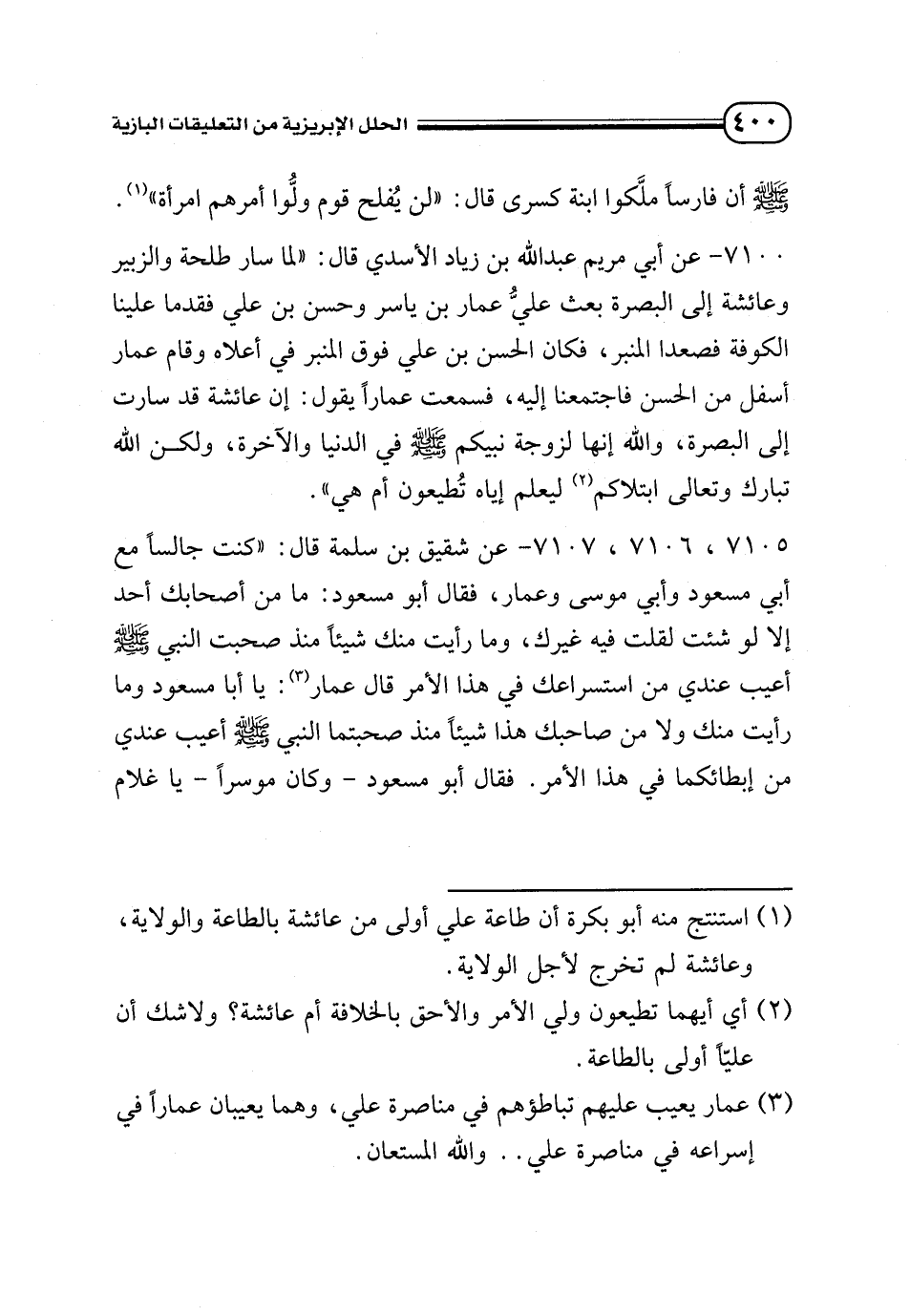 (¬1) استنتج منه أبو بكرة أن طاعة علي أولى من عائشة بالطاعة والولاية، وعائشة لم تخرج لأجل الولاية.
