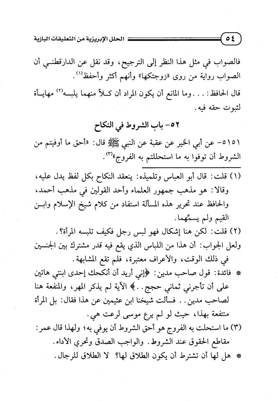 5151 - عن أبي الخير عن عقبة عن النبي - صلى الله عليه وسلم - قال: «أحق ما أوفيتم من الشروط أن توفوا به ما استحللتم به الفروج» (¬3).