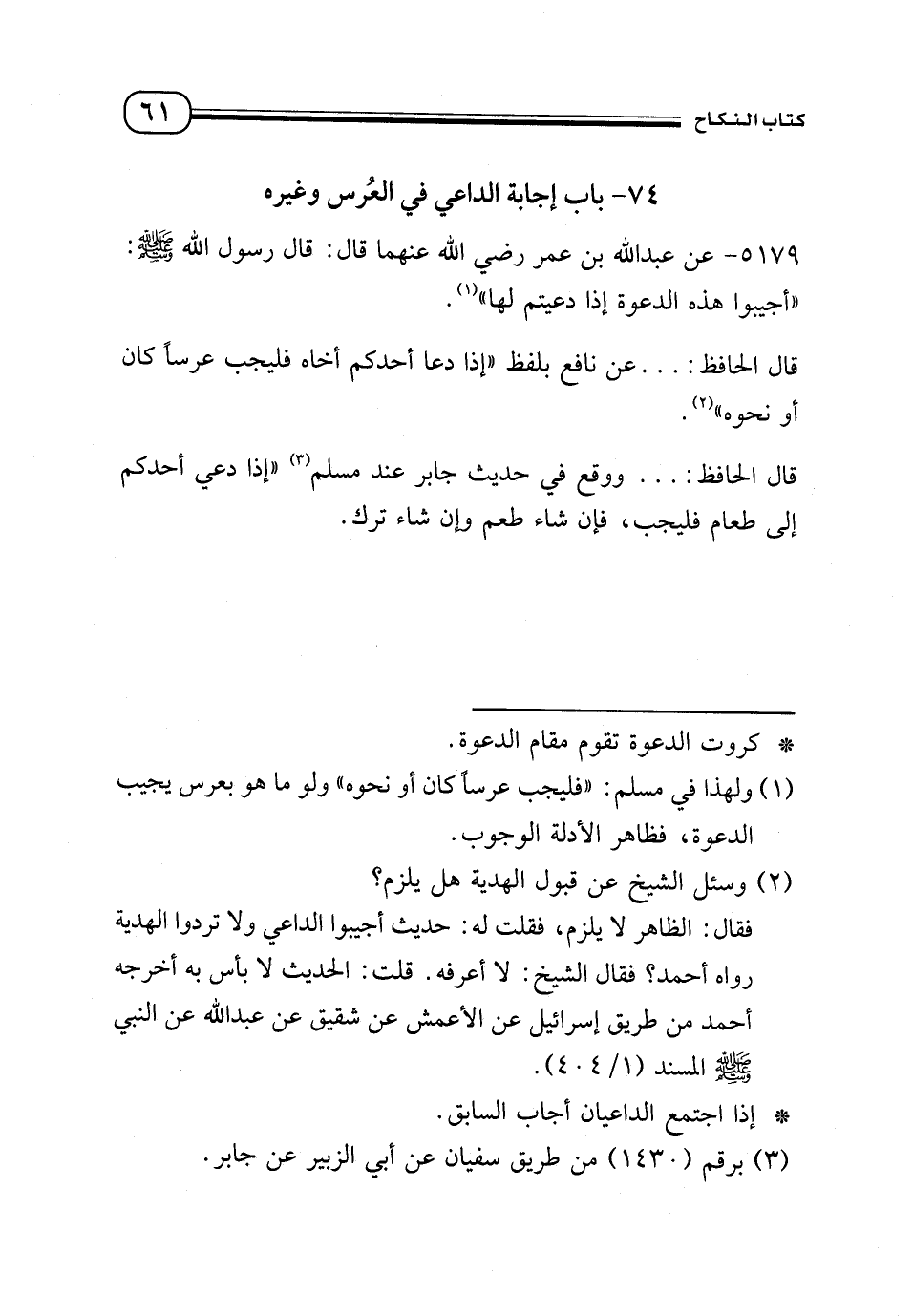 (¬1) ولهذا في مسلم: «فليجب عرسًا كان أو نحوه» ولو ما هو بعرس يجيب الدعوة، فظاهر الأدلة الوجوب.