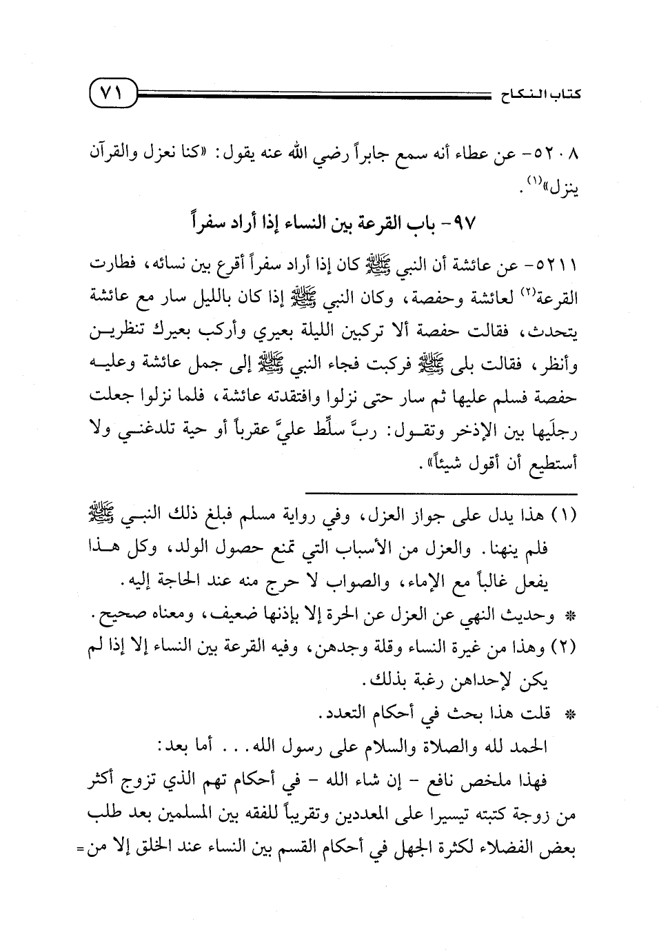 5211 - عن عائشة أن النبي - صلى الله عليه وسلم - كان إذا أراد سفرًا أقرع بين نسائه، فطارت القرعة (¬2)