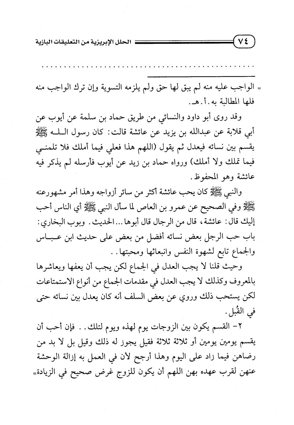 وقد روى أبو داود والنسائي من طريق حماد بن سلمة عن أيوب عن أبي قلابة عن عبدالله بن يزيد عن عائشة قالت: كان رسول الله - صلى الله عليه وسلم - يقسم بين نسائه فيعدل ثم يقول (اللهم هذا فعلي فيما أملك فلا تلمني فيما تملك ولا أملك) ورواه حماد بن زيد عن أيوب فأرسله لم يذكر فيه عائشة وهو المحفوظ.
