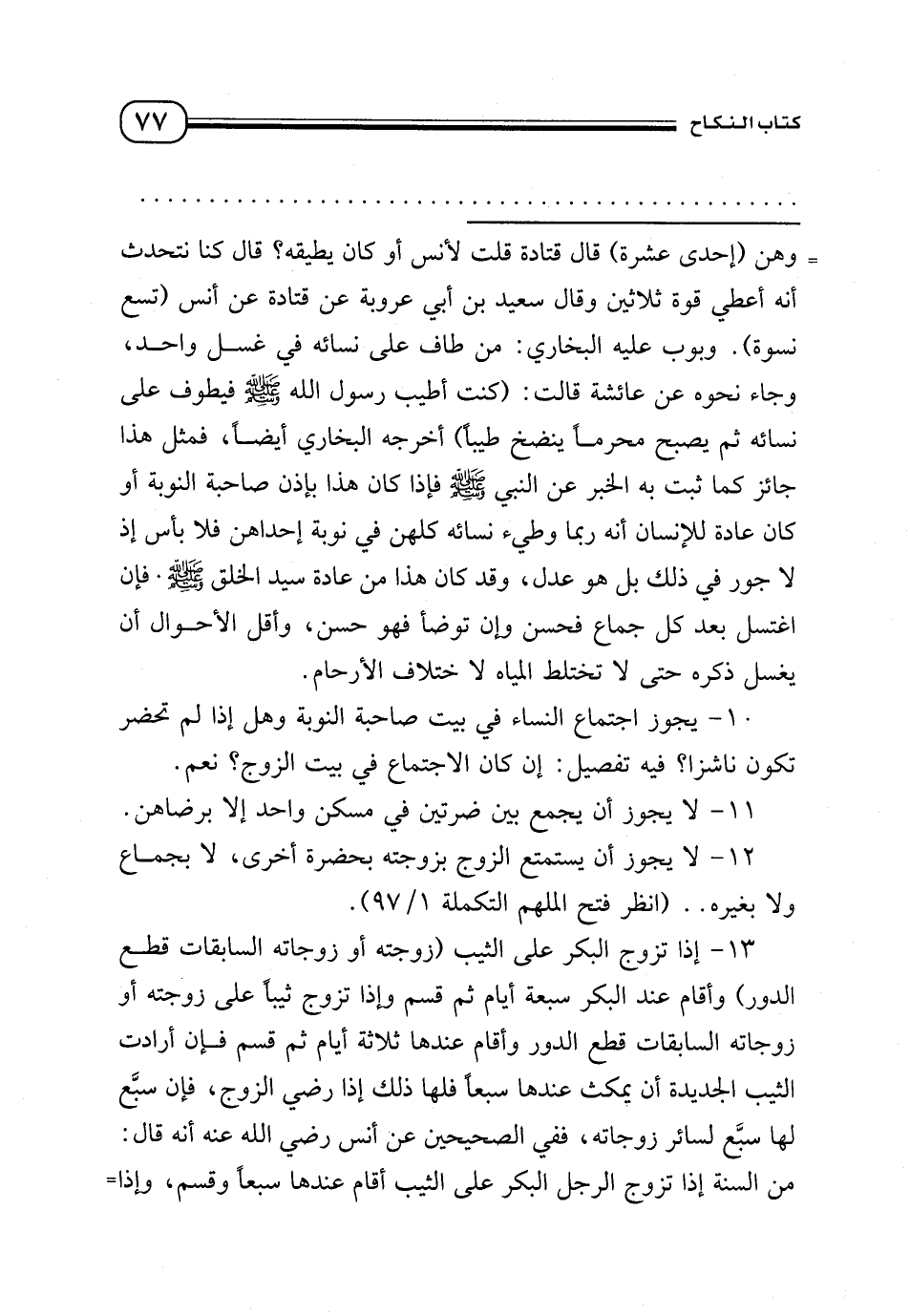 13 - إذا تزوج البكر على الثيب (زوجته أو زوجاته السابقات قطع الدور) وأقام عند البكر سبعة أيام ثم قسم وإذا تزوج ثيبًا على زوجته أو زوجاته السابقات قطع الدور وأقام عندها ثلاثة أيام ثم قسم فإن أرادت الثيب الجديدة أن يمكث عندها سبعًا فلها ذلك إذا رضي الزوج، فإن سبَّع لها سبَّع لسائر زوجاته، ففي الصحيحين عن أنس - رضي الله عنه - أنه قال: من السنة إذا تزوج الرجل البكر على الثيب أقام عندها سبعًا وقسم، وإذا =