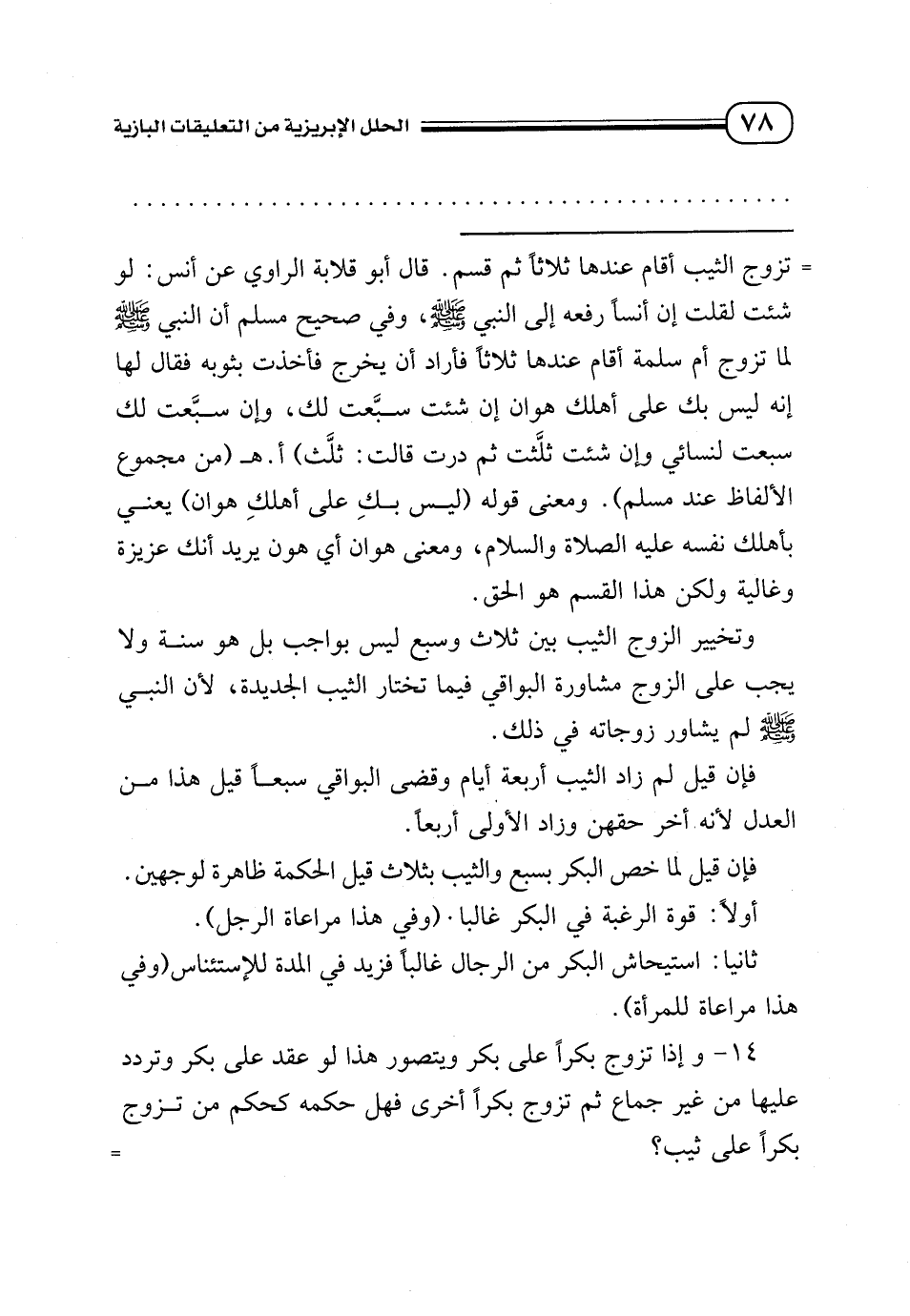 = تزوج الثيب أقام عندها ثلاثًا ثم قسم. قال أبو قلابة الراوي عن أنس: لو شئت لقلت إن أنسًا رفعه إلى النبي - صلى الله عليه وسلم -، وفي صحيح مسلم أن النبي - صلى الله عليه وسلم - لما تزوج أم سلمة أقام عندها ثلاثًا فأراد أن يخرج فأخذت بثوبه فقال لها إنه ليس بك على أهلك هوان إن شئت سبَّعت لك، وإن سبَّعت لك سبعت لنسائي وإن شئت ثلَّثت ثم درت قالت: ثلَّث) أ. هـ- (من مجموع الألفاظ عند مسلم). ومعنى قوله (ليس بكِ على أهلكِ هوان) يعني بأهلك نفسه عليه الصلاة والسلام، ومعنى هوان أي هون يريد أنك عزيزة وغالية ولكن هذا القسم هو الحق.