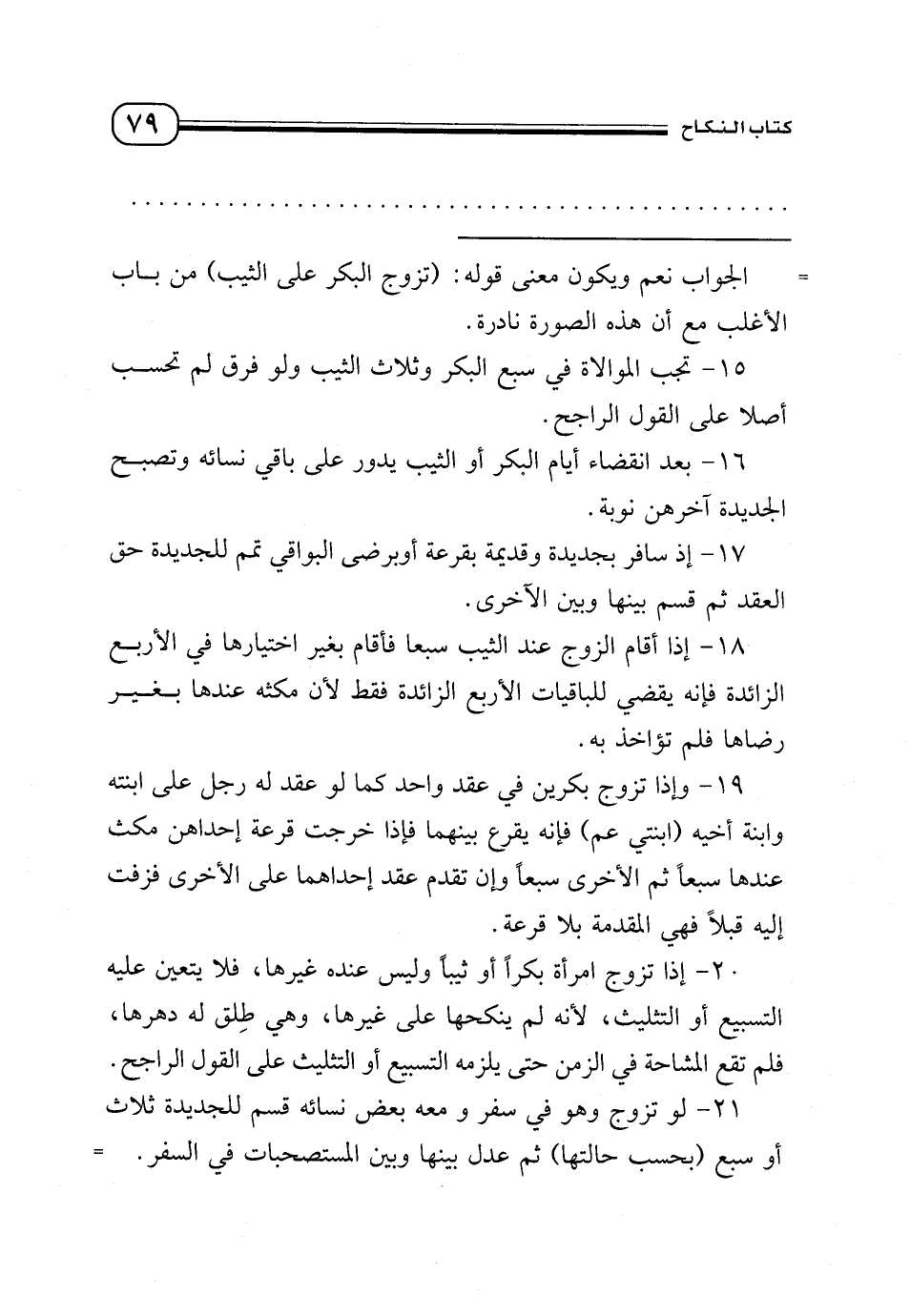 20 - إذا تزوج امرأة بكرًا أو ثيبًا وليس عنده غيرها، فلا يتعين عليه التسبيع أو التثليث، لأنه لم ينكحها على غيرها، وهي طِلق له دهرها، فلم تقع المشاحة في الزمن حتى يلزمه التسبيع أو التثليث على القول الراجح.