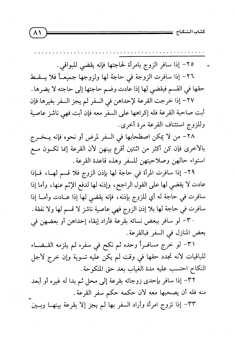 27 - إذا خرجت القرعة لإحداهن في السفر لم يجز السفر بغيرها فإن أبت صاحبة القرعة فله إكراهها على السفر معه فإن أبت فهي ناشز عاصية وللزوج استئناف القرعة مرة أخرى.