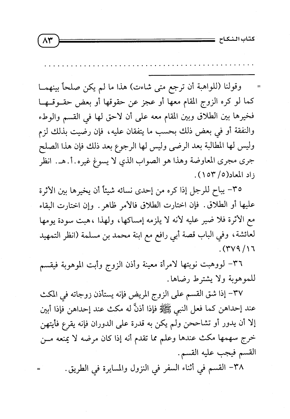 35 - يباح للرجل إذا كره من إحدى نسائه شيئًا أن يخبرها بين الأثرة عليها أو الطلاق. فإن اختارت الطلاق فالأمر ظاهر. وإن اختارت البقاء مع الأثرة فلا صبر عليه لأنه لا يلزمه إمساكها، ولهذا، هبت سودة يومها لعائشة، وفي الباب قصة أبي رافع مع ابنة محمد بن مسلمة (انظر التمهيد 16/ 379).